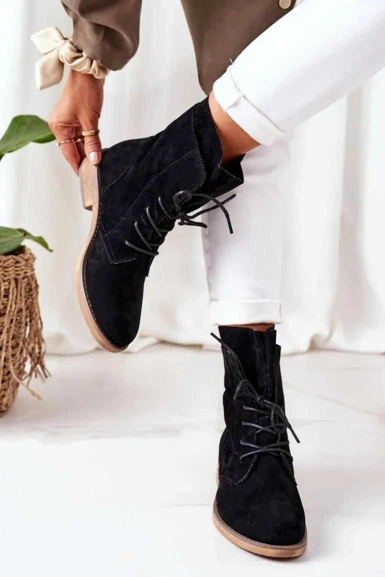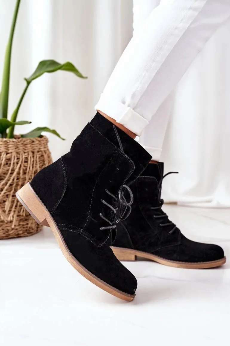 Botki damskie wykonane z eko zamszu z wyjątkową, podwójną cholewką. Wkładka jest ocieplana. Przy wyborze rozmiaru prosimy sugerować się tabelą rozmiarów.