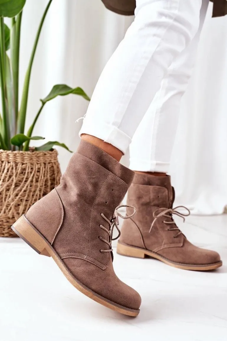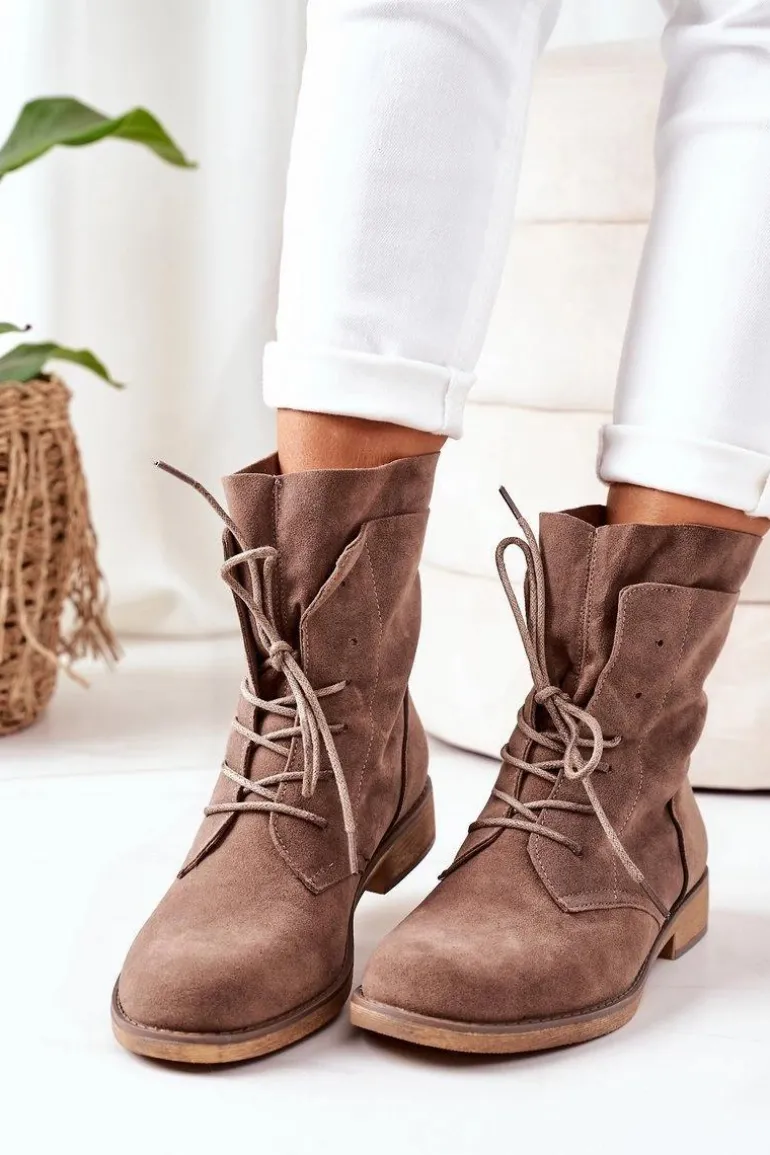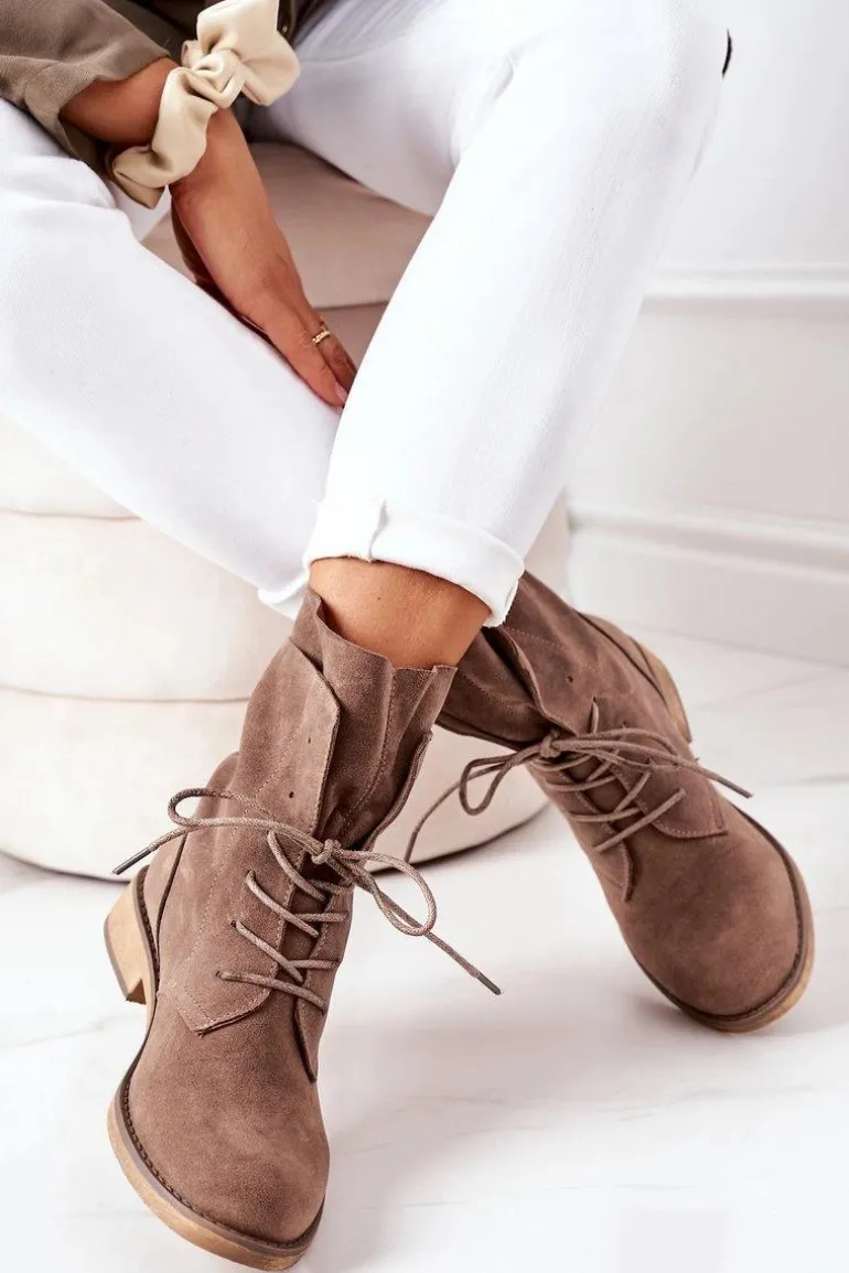 Botki damskie wykonane z eko zamszu z wyjątkową, podwójną cholewką. Wkładka jest ocieplana. Przy wyborze rozmiaru prosimy sugerować się tabelą rozmiarów.