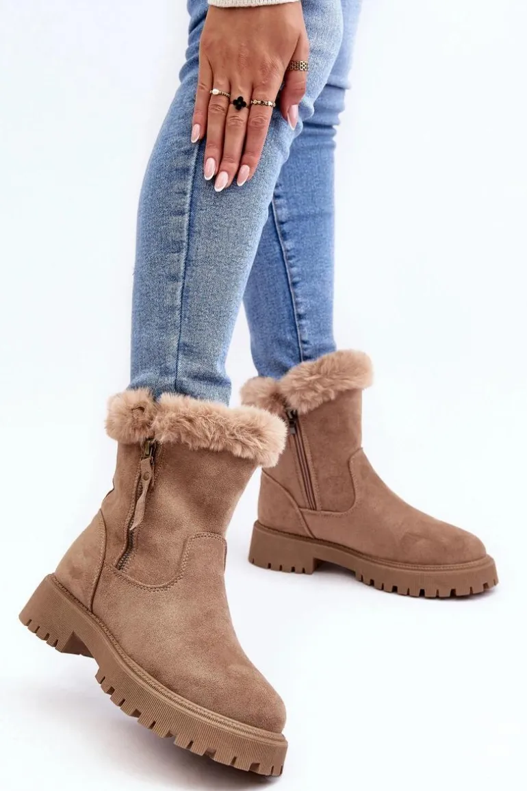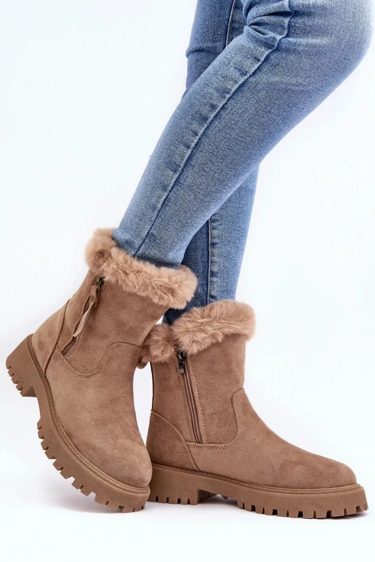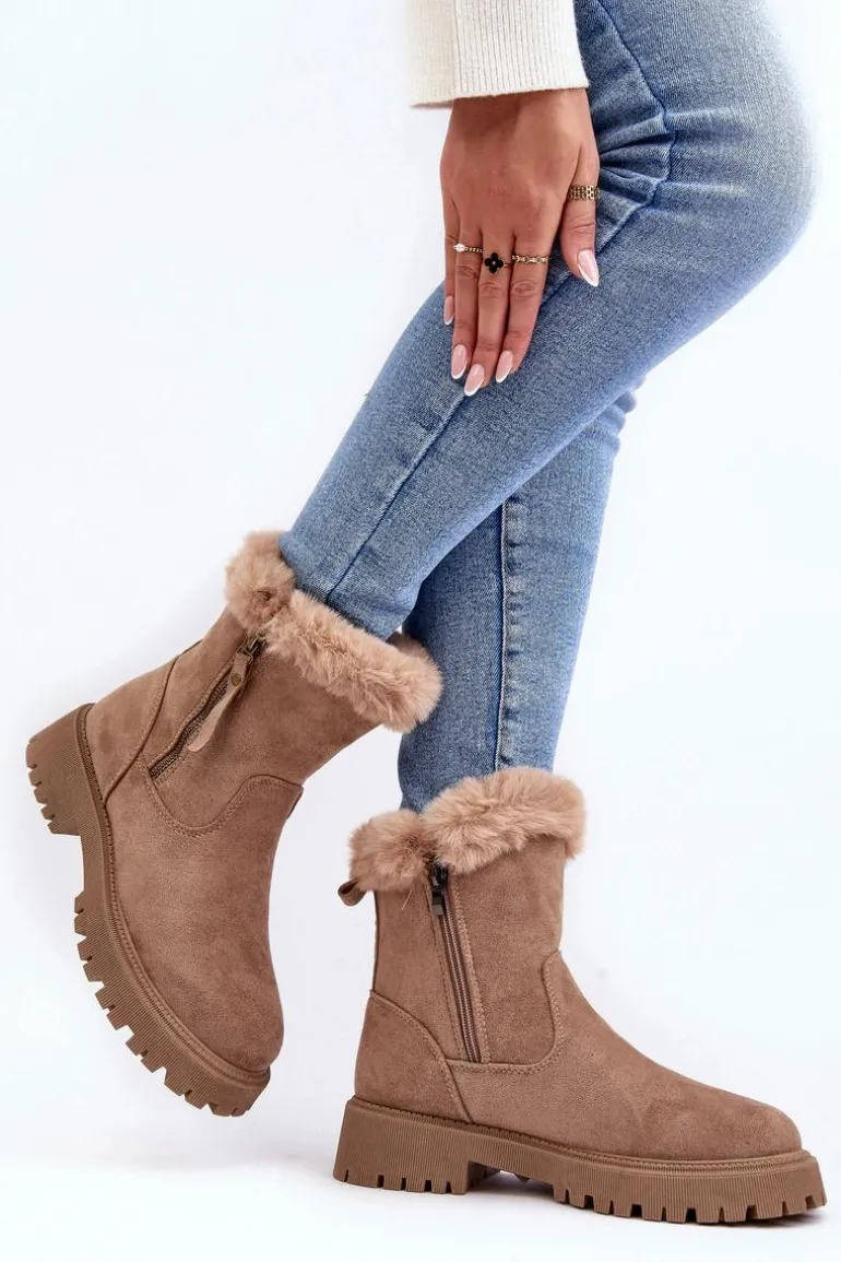 Botki z cholewką zakończoną miękkim futerkiem. Model ten posiada suwak z boku cholewki — jeden ozdobny, drugi ułatwiający zakładanie obuwia. Osadzone na płaskim obcasie i platformie. Ocieplone wewnątrz grubym futerkiem. Zapiętek jest usztywniany. Idealny model na chłodne dni! Przy wyborze rozmiaru prosimy sugerować się tabelą rozmiarów.