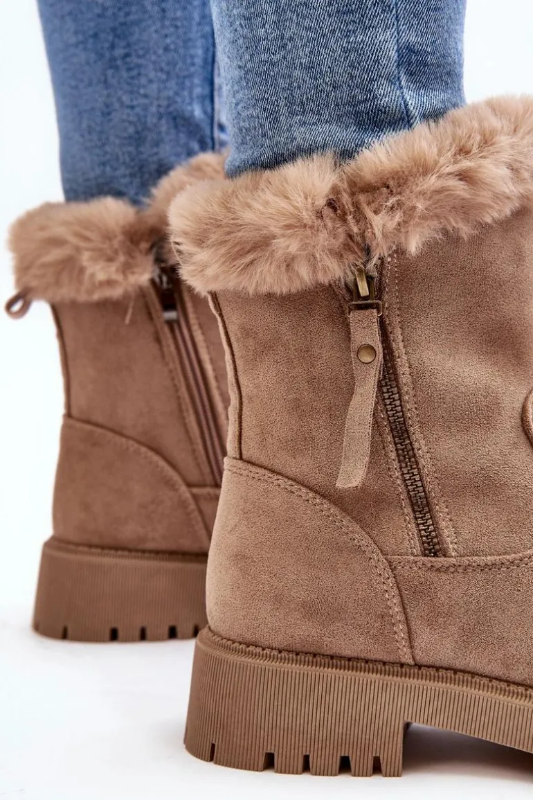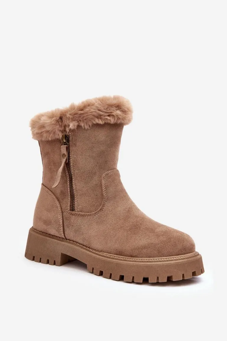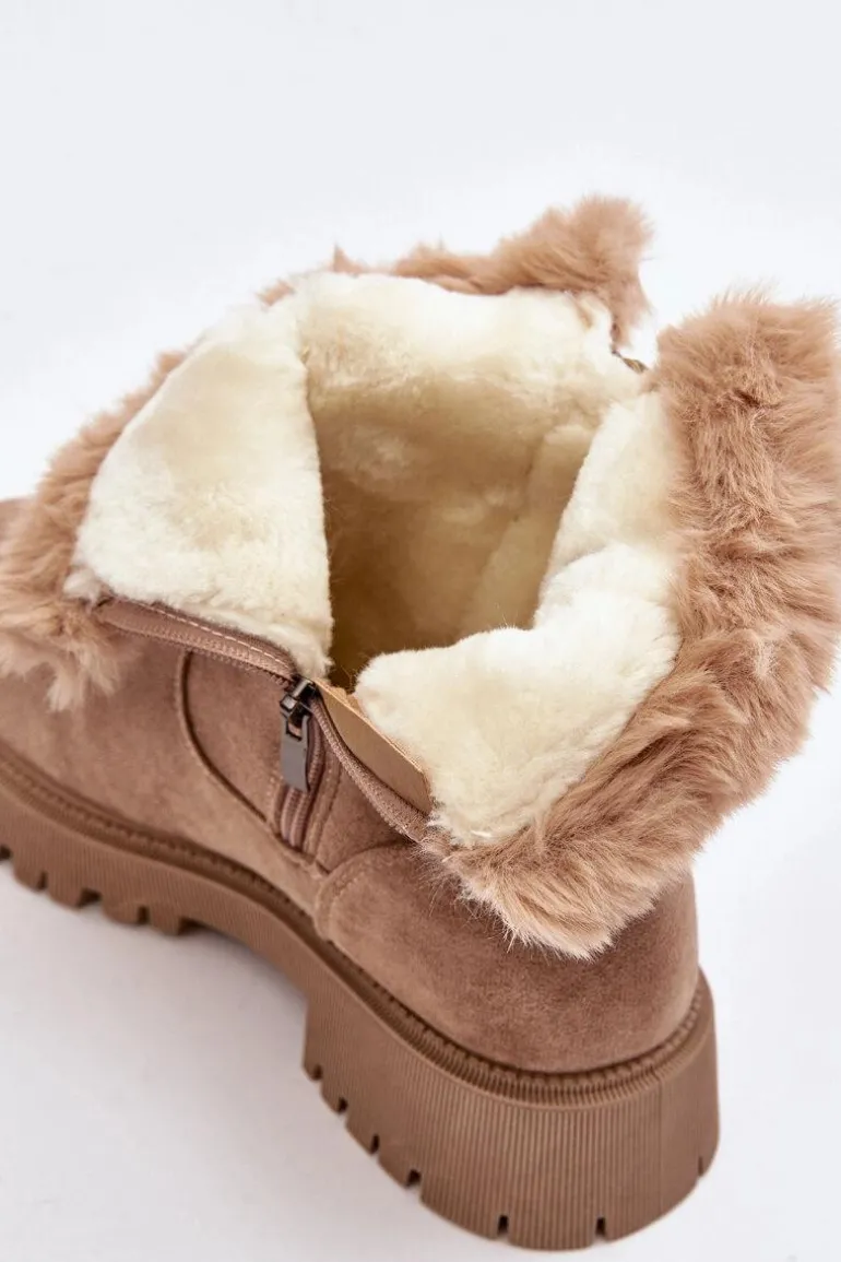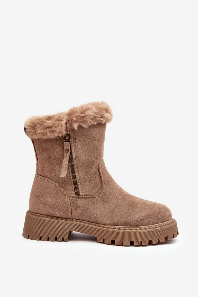 Botki z cholewką zakończoną miękkim futerkiem. Model ten posiada suwak z boku cholewki — jeden ozdobny, drugi ułatwiający zakładanie obuwia. Osadzone na płaskim obcasie i platformie. Ocieplone wewnątrz grubym futerkiem. Zapiętek jest usztywniany. Idealny model na chłodne dni! Przy wyborze rozmiaru prosimy sugerować się tabelą rozmiarów.