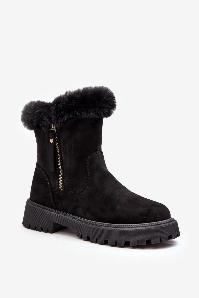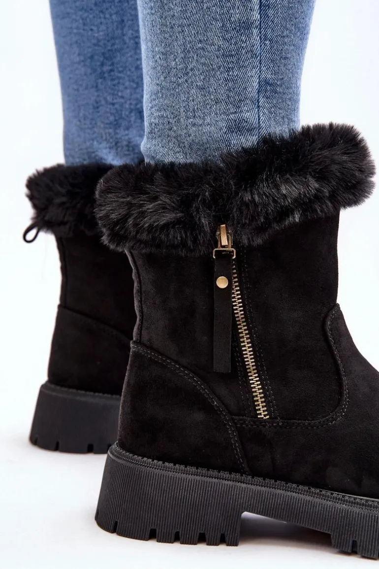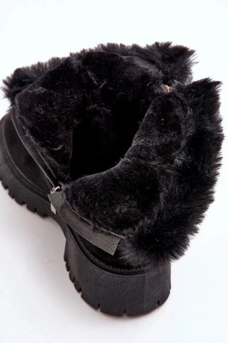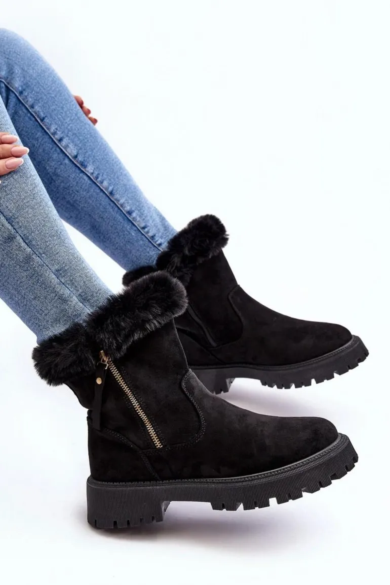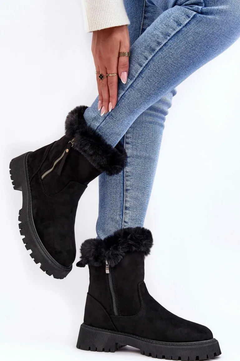 Botki z cholewką zakończoną miękkim futerkiem. Model ten posiada suwak z boku cholewki — jeden ozdobny, drugi ułatwiający zakładanie obuwia. Osadzone na płaskim obcasie i platformie. Ocieplone wewnątrz grubym futerkiem. Zapiętek jest usztywniany. Idealny model na chłodne dni! Przy wyborze rozmiaru prosimy sugerować się tabelą rozmiarów.