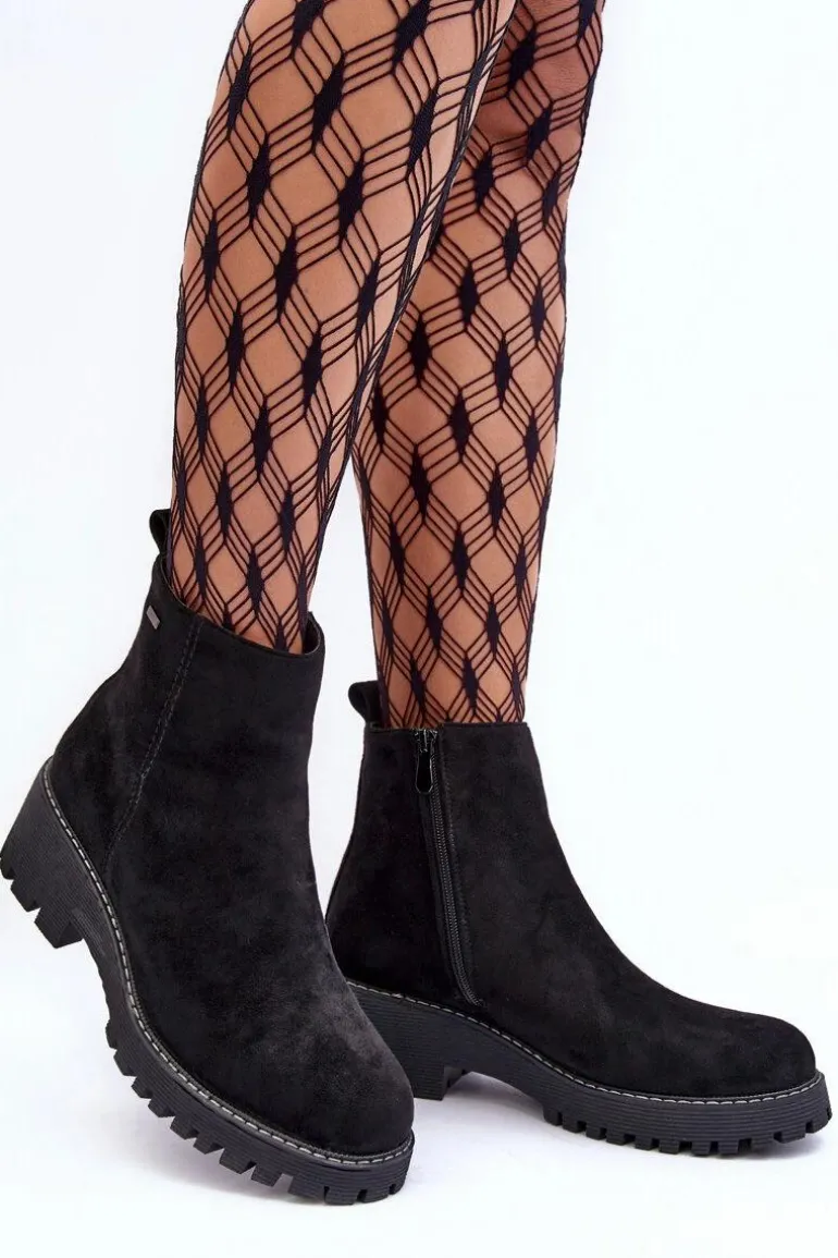 Klasyczne botki damskie osadzone na płaskim, stabilnym obcasie i platformie. Wykonane z eko zamszu. Zapinane na suwak po wewnętrznej stronie cholewki. Zapiętek jest usztywniony, noski zaokrąglone. Wnętrze ocieplone kocem obuwniczym. Świetny model na chłodniejsze dni! Przy wyborze rozmiaru prosimy sugerować się tabelą rozmiarów.