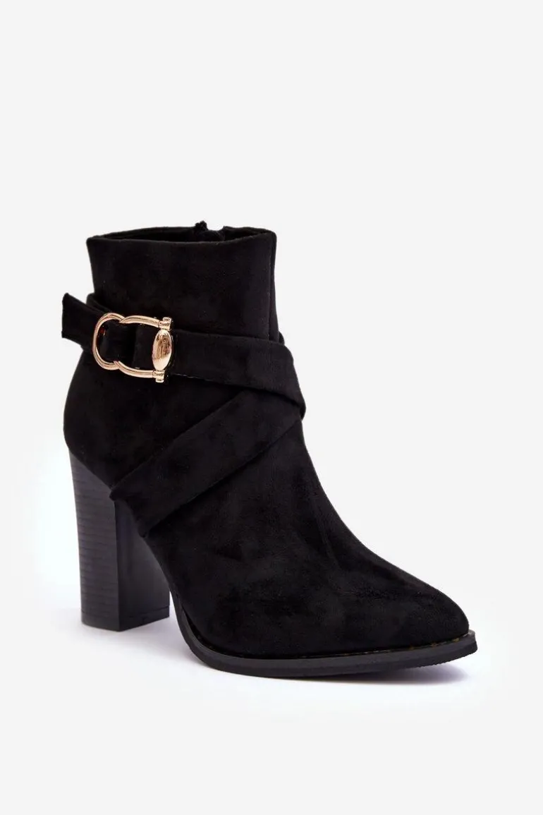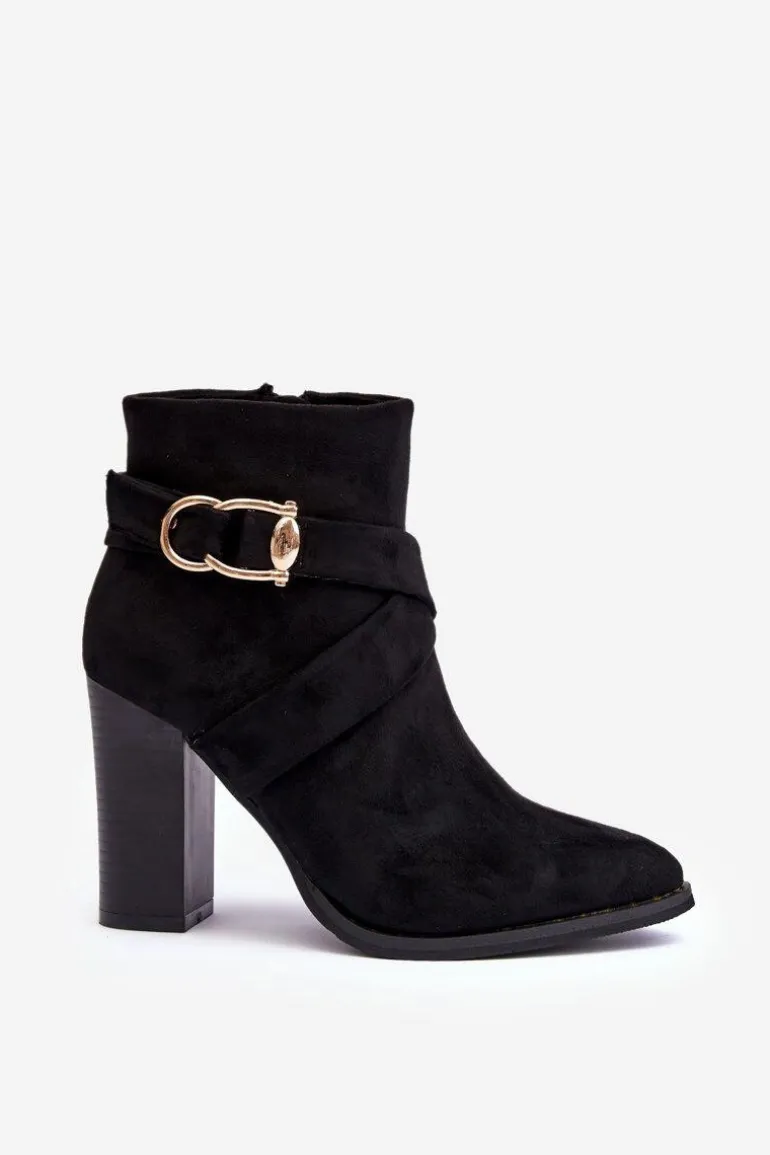 Eleganckie botki za kostkę wykonane z eko zamszu. Osadzone na wysokim obcasie w postaci słupka. Cholewka ozdobiona paskami z klamrą. Model zapinany na suwak. Zapiętek usztywniony, wnętrze ocieplone kocem obuwniczym. Idealny model do eleganckich i imprezowych stylizacji. Przy wyborze rozmiaru prosimy sugerować się tabelą rozmiarów.