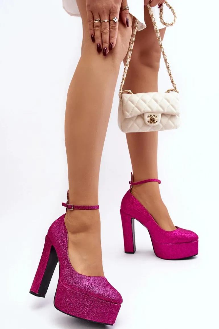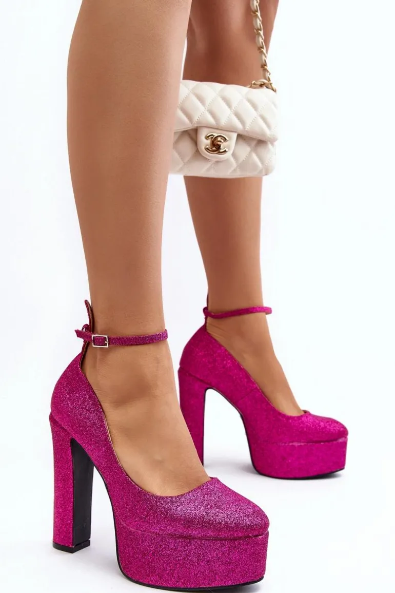 Brokatowe czółenka na słupku z masywną platformą z pewnością zachwycą kobiety, które kochają wysokie obcasy! Zapinane na sprzączkę z regulowanym paskiem. Miękka, eko skórzana wkładka zapewni komfort podczas użytkowania. Idealne na wieczorne wyjścia! Przy wyborze rozmiaru prosimy kierować się tabelą rozmiarów