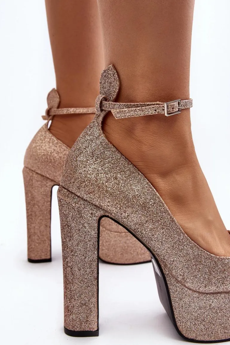 Brokatowe czółenka na słupku z masywną platformą z pewnością zachwycą kobiety, które kochają wysokie obcasy! Zapinane na sprzączkę z regulowanym paskiem. Miękka, eko skórzana wkładka zapewni komfort podczas użytkowania. Idealne na wieczorne wyjścia! Przy wyborze rozmiaru prosimy kierować się tabelą rozmiarów
