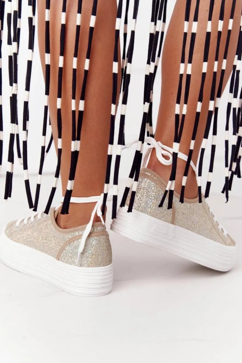 Damskie tenisówki na platformie ozdobione kolorowym brokatem. Tenisówki posiadają miękką, materiałową wkładkę oraz antypoślizgową podeszwę. Przy wyborze rozmiaru prosimy sugerować się tabelą rozmiarów.