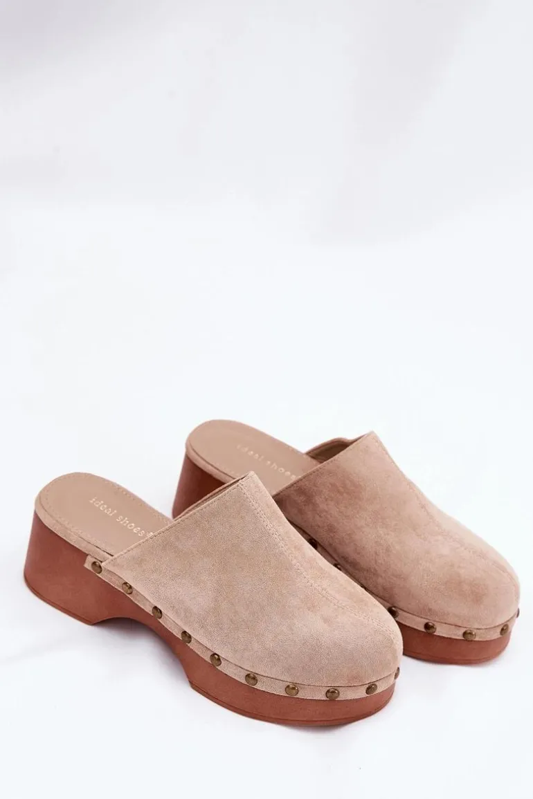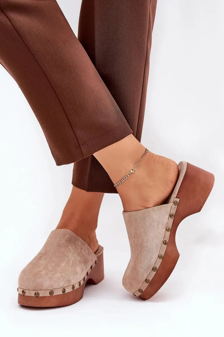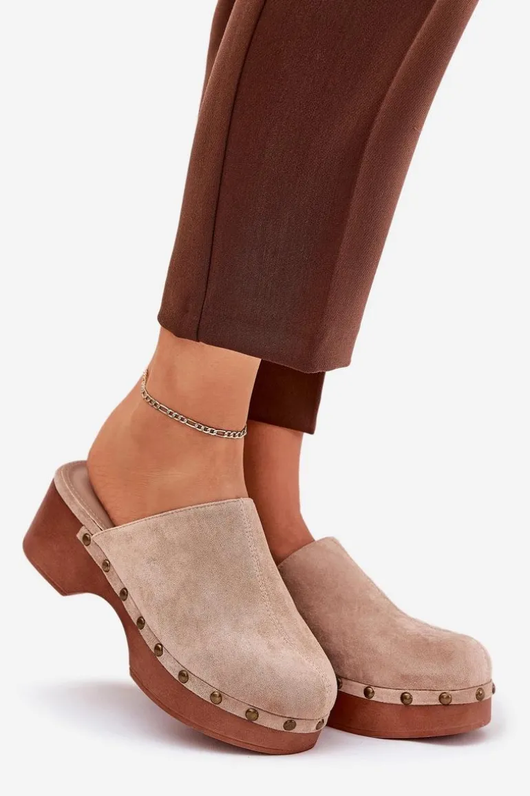 Lekkie klapki chodaki damskie wykonane z eko zamszu. Osadzone na platformie i koturnie. Ozdobione ćwiekami, które nadają im modnego i niepowtarzalnego charakteru. Wewnątrz znajduje się miękka eko skórzana wkładka, która gwarantuje komfort przez cały dzień. Klapki posiadają zakryte, zaokrąglone noski. Idealne na co dzień, doskonale komponują się z letnimi sukienkami, spódnicami i spodniami. Przy wyborze rozmiaru prosimy sugerować się tabelą rozmiarów.