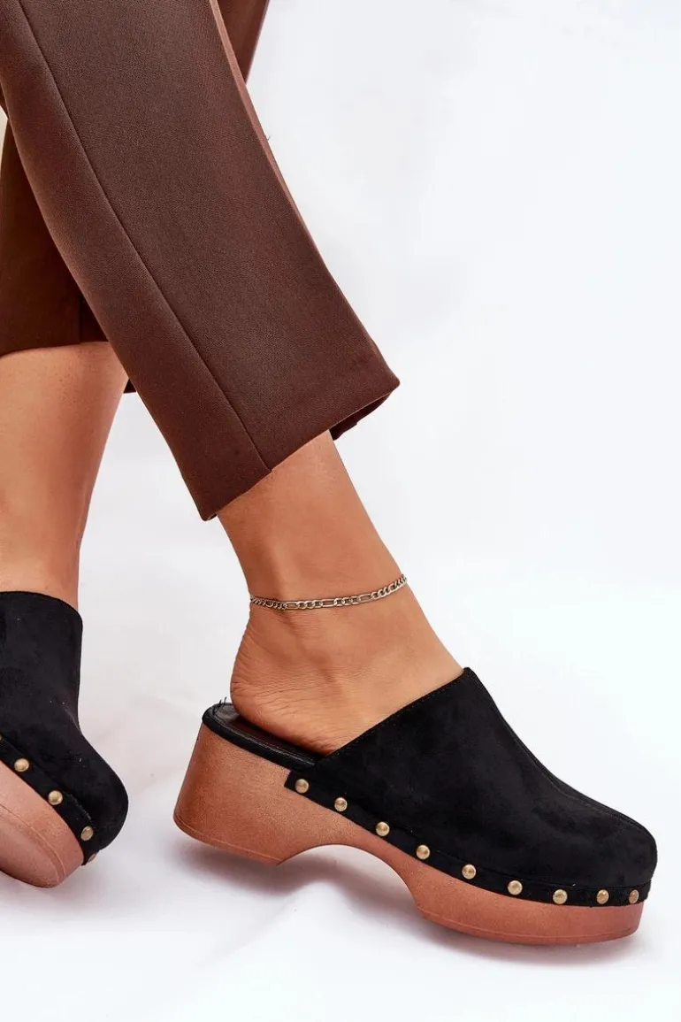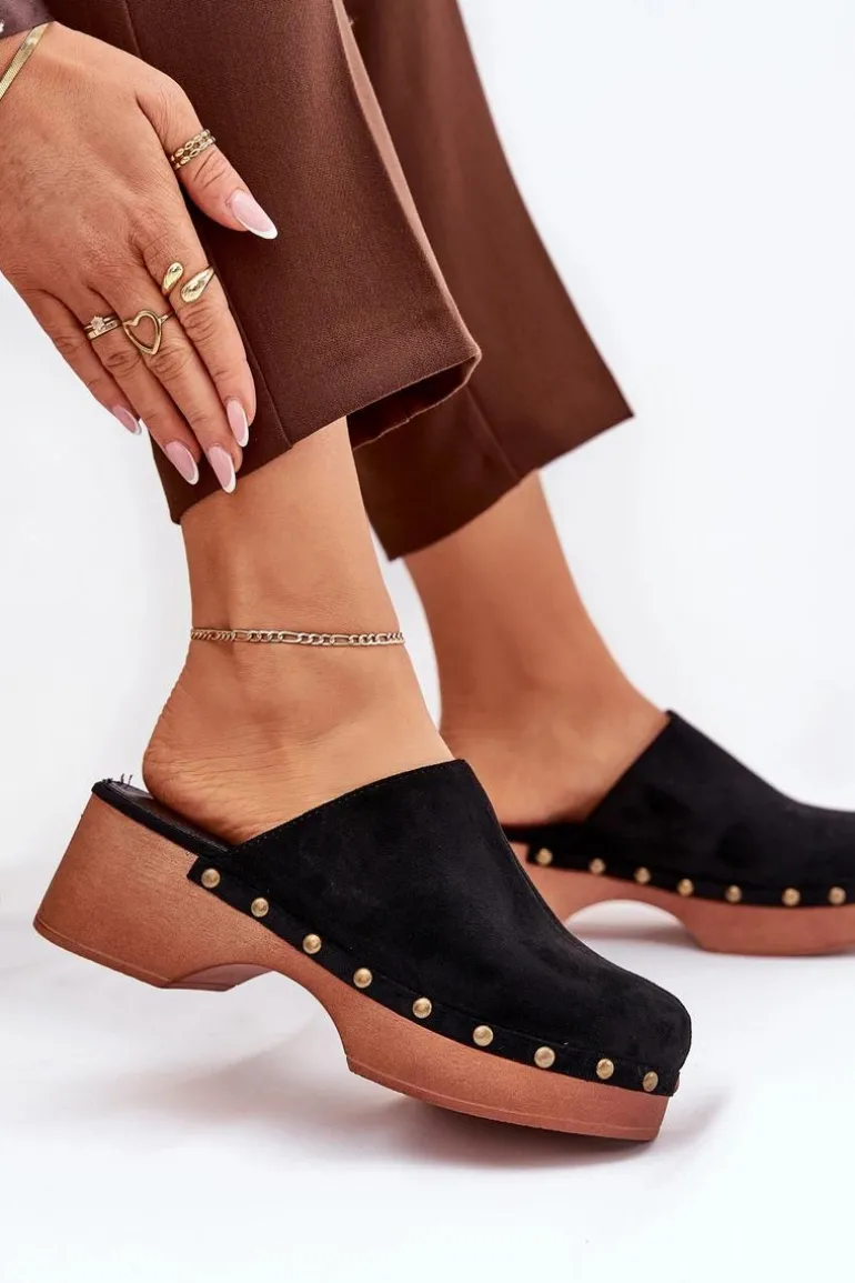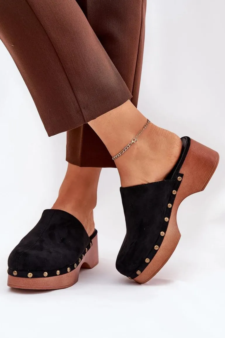 Lekkie klapki chodaki damskie wykonane z eko zamszu. Osadzone na platformie i koturnie. Ozdobione ćwiekami, które nadają im modnego i niepowtarzalnego charakteru. Wewnątrz znajduje się miękka eko skórzana wkładka, która gwarantuje komfort przez cały dzień. Klapki posiadają zakryte, zaokrąglone noski. Idealne na co dzień, doskonale komponują się z letnimi sukienkami, spódnicami i spodniami. Przy wyborze rozmiaru prosimy sugerować się tabelą rozmiarów.