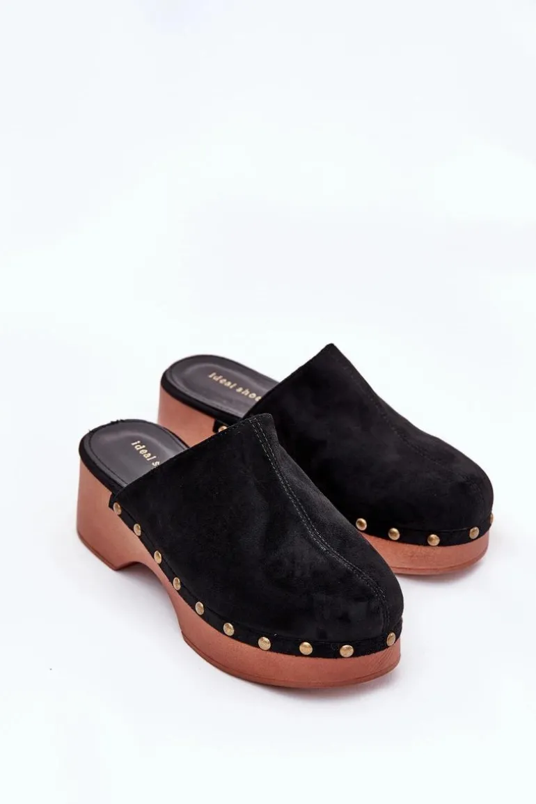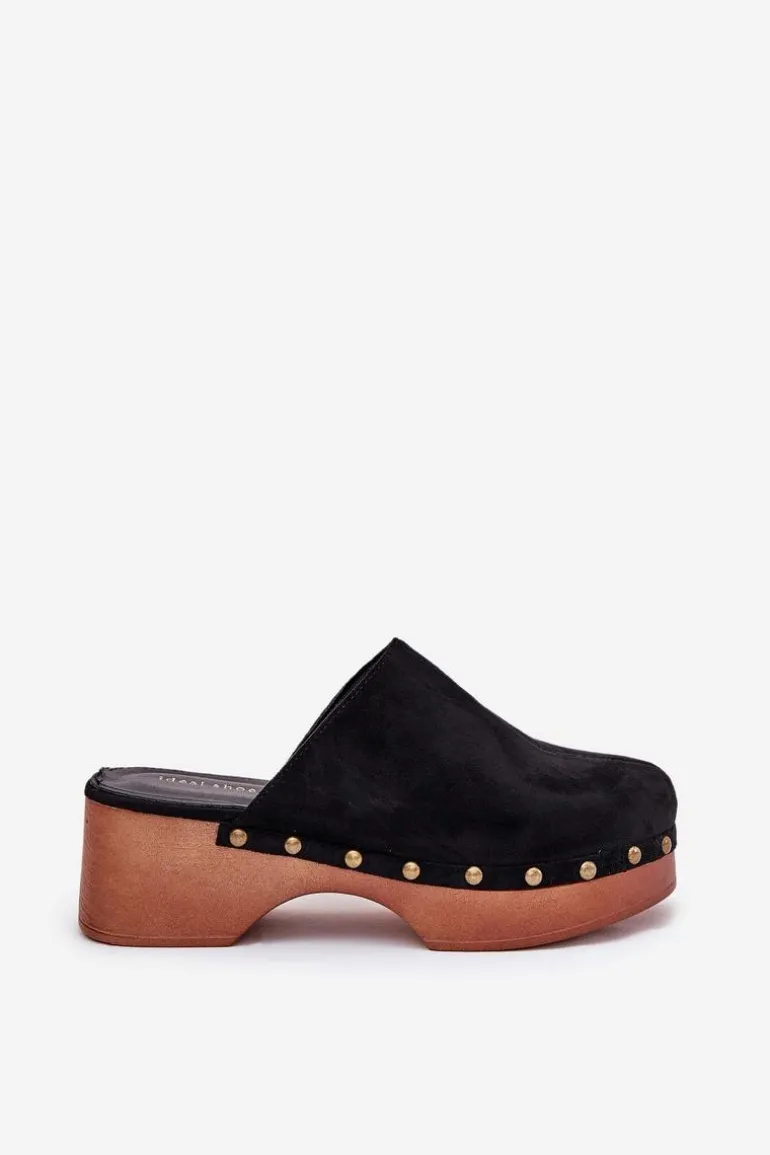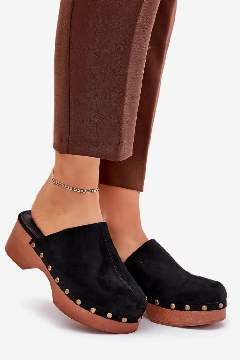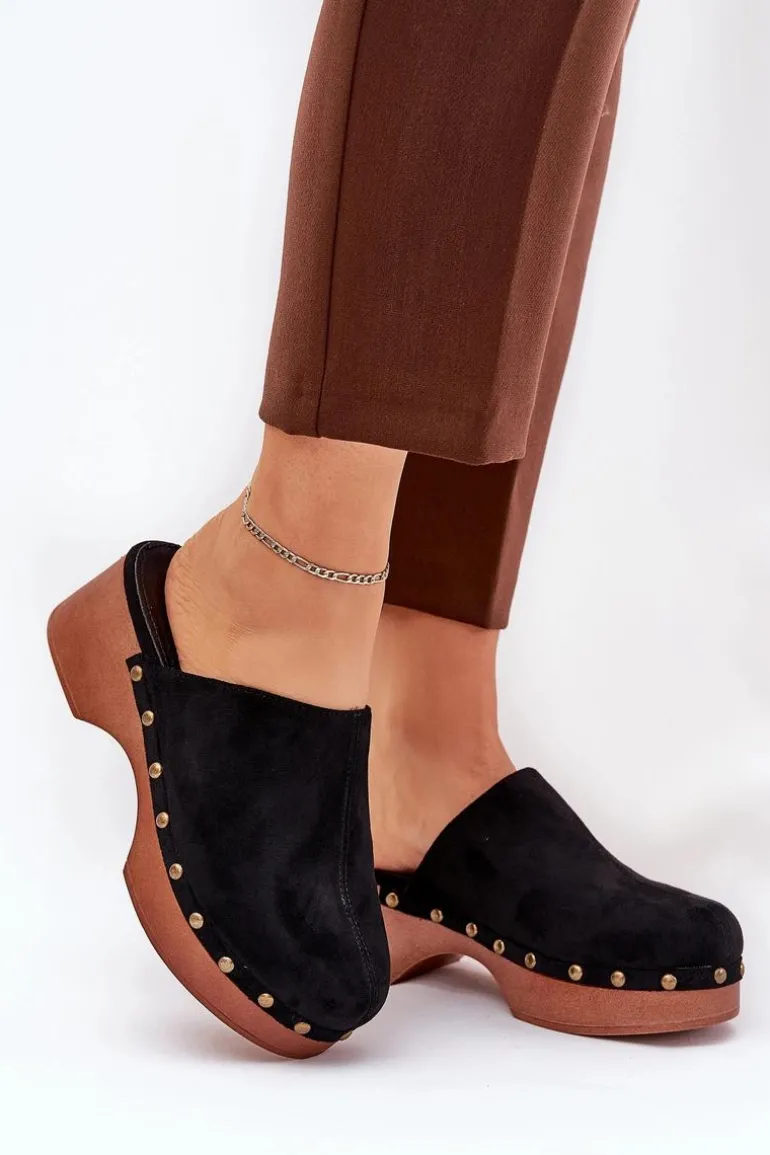Lekkie klapki chodaki damskie wykonane z eko zamszu. Osadzone na platformie i koturnie. Ozdobione ćwiekami, które nadają im modnego i niepowtarzalnego charakteru. Wewnątrz znajduje się miękka eko skórzana wkładka, która gwarantuje komfort przez cały dzień. Klapki posiadają zakryte, zaokrąglone noski. Idealne na co dzień, doskonale komponują się z letnimi sukienkami, spódnicami i spodniami. Przy wyborze rozmiaru prosimy sugerować się tabelą rozmiarów.