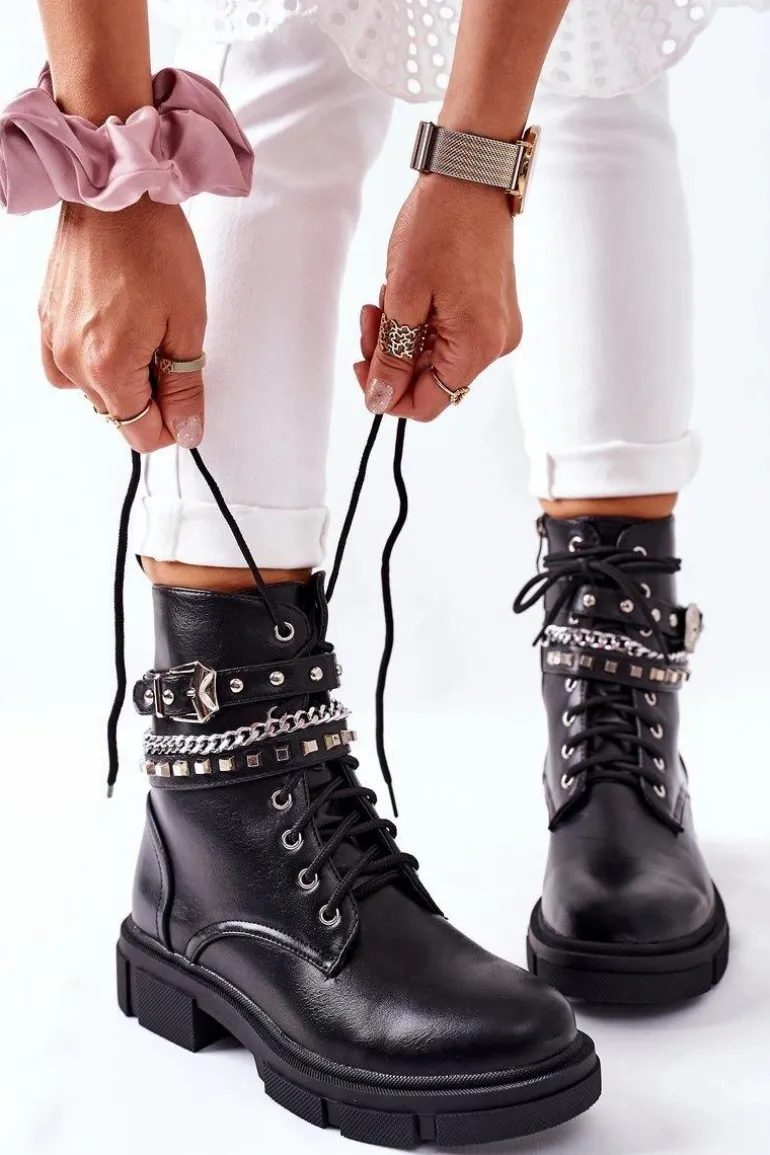 Niezwykłe i stylowe botki wykonane ze skóry ekologicznej. Zapinane na zamek oraz klamrę. Dodatkowy ozdobny łańcuch na cholewce. Przy wyborze rozmiaru prosimy sugerować się tabelą rozmiarów.