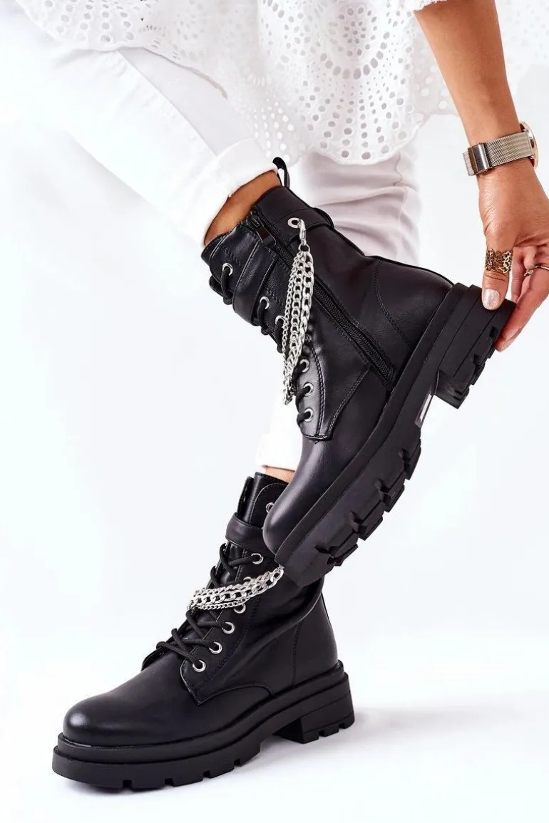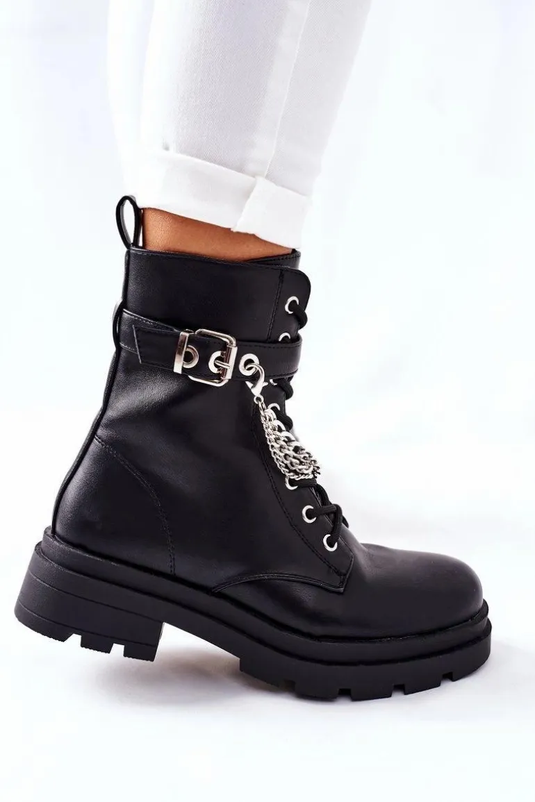 Niezwykłe i stylowe botki wykonane ze skóry ekologicznej. Zapinane na zamek oraz klamrę. Dodatkowy ozdobny łańcuch na cholewce. Przy wyborze rozmiaru prosimy sugerować się tabelą rozmiarów.
