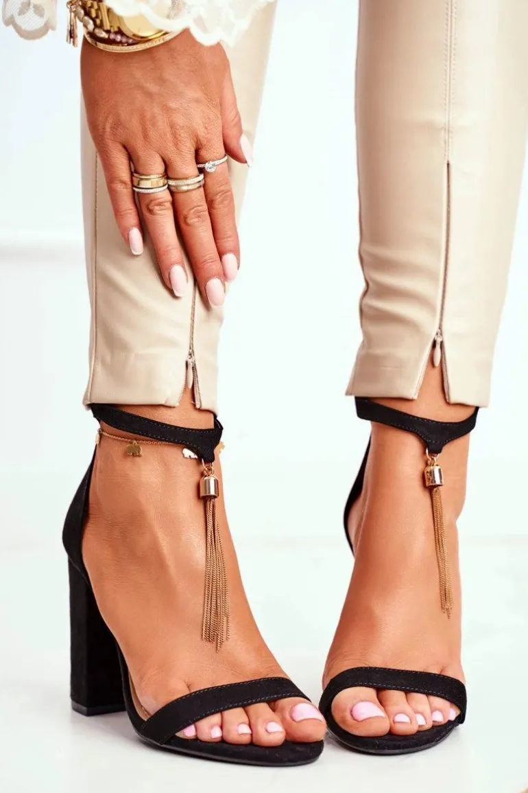 Czarne Zamszowe Sandałki na Słupku z Frędzlem Annick