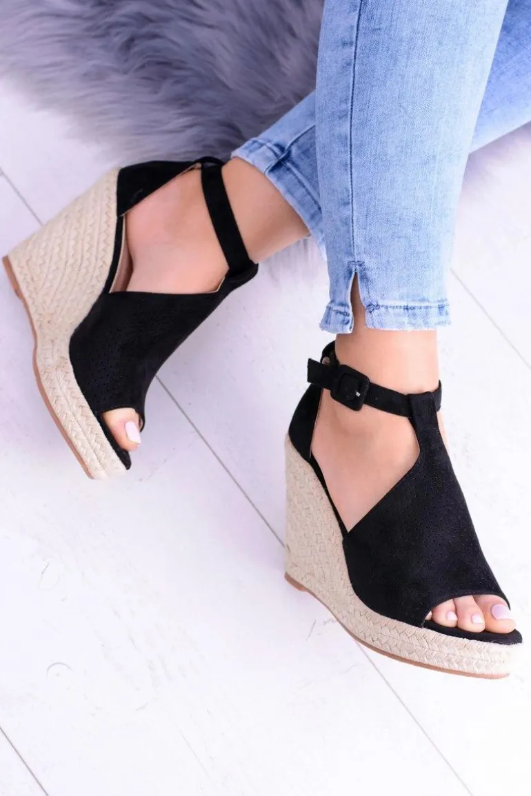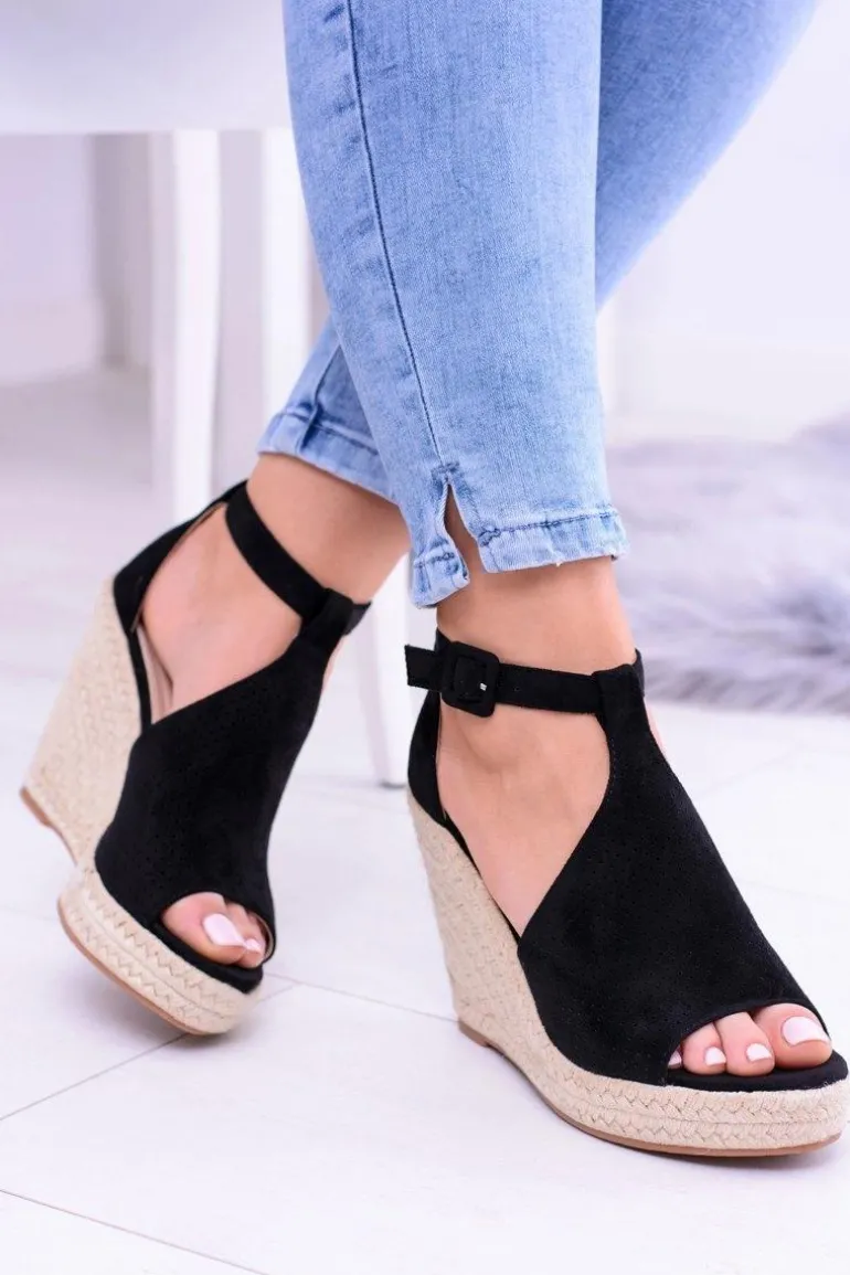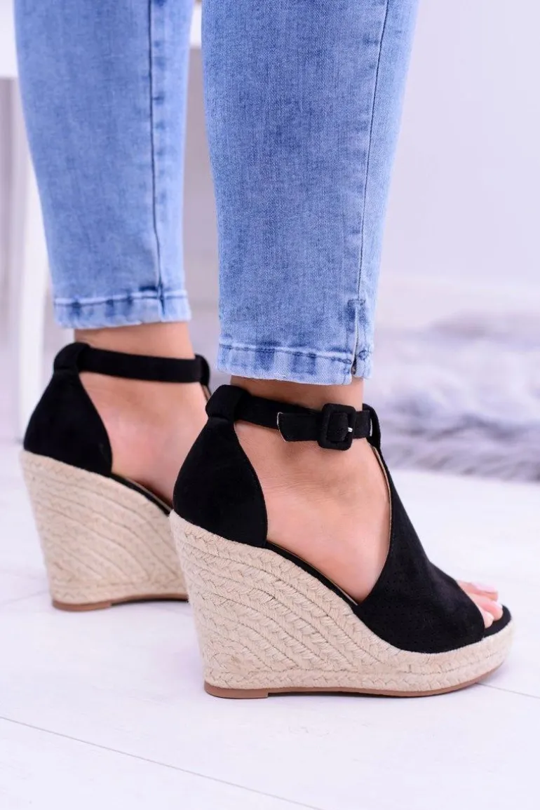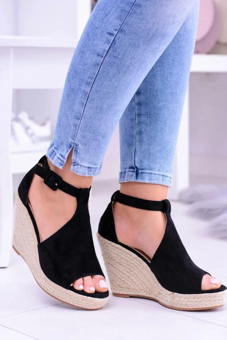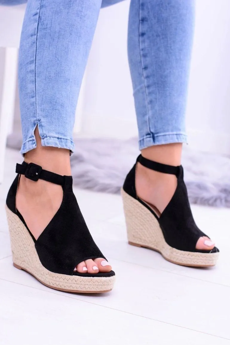 Czarne Zamszowe Sandały Na Koturnie Sunlast