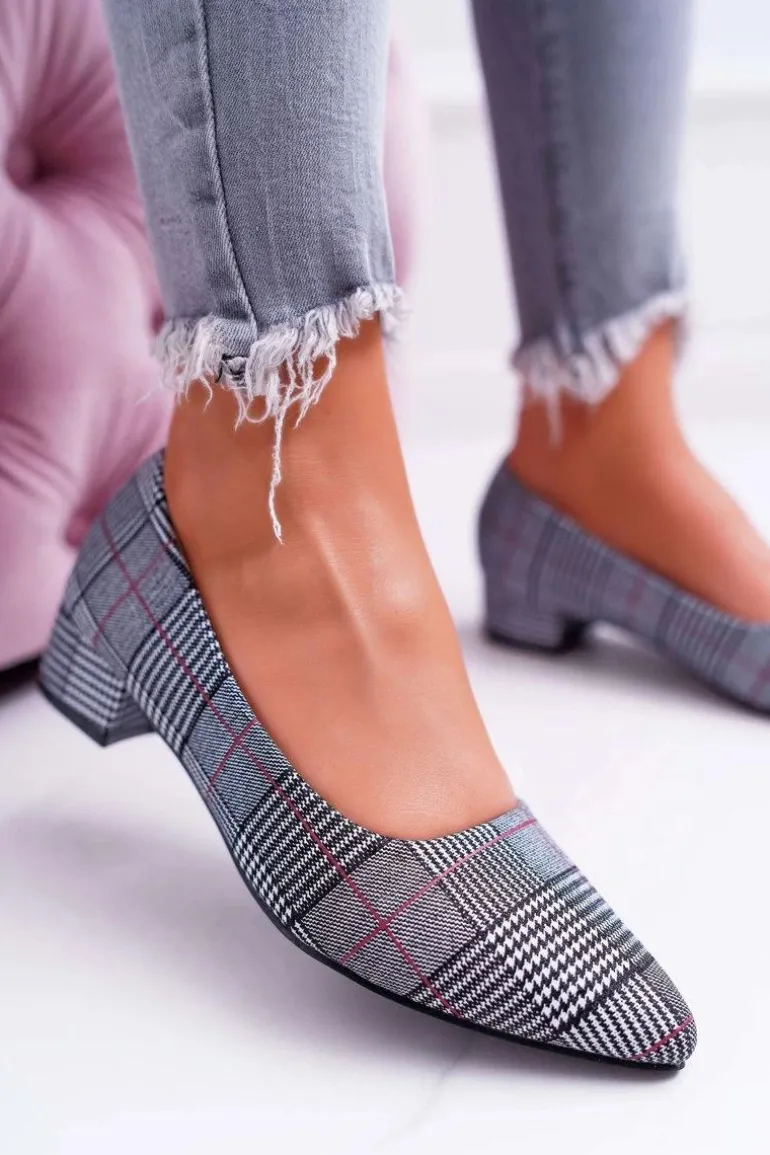 Klasyczne czółenka damskie ze wzorem w kratkę! Idealnie nadają się na eleganckie okazje! Model oparty na stabilnym, niskim słupku. Wkładka wykonana ze skóry ekologicznej, która zapewni komfort i wygodę. Pięknie prezentują się na nodze i eksponują naszą sylwetkę! Podczas wyboru rozmiaru prosimy sugerować się tabelą rozmiarów.