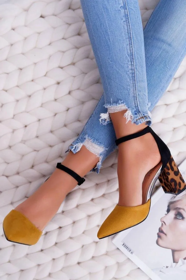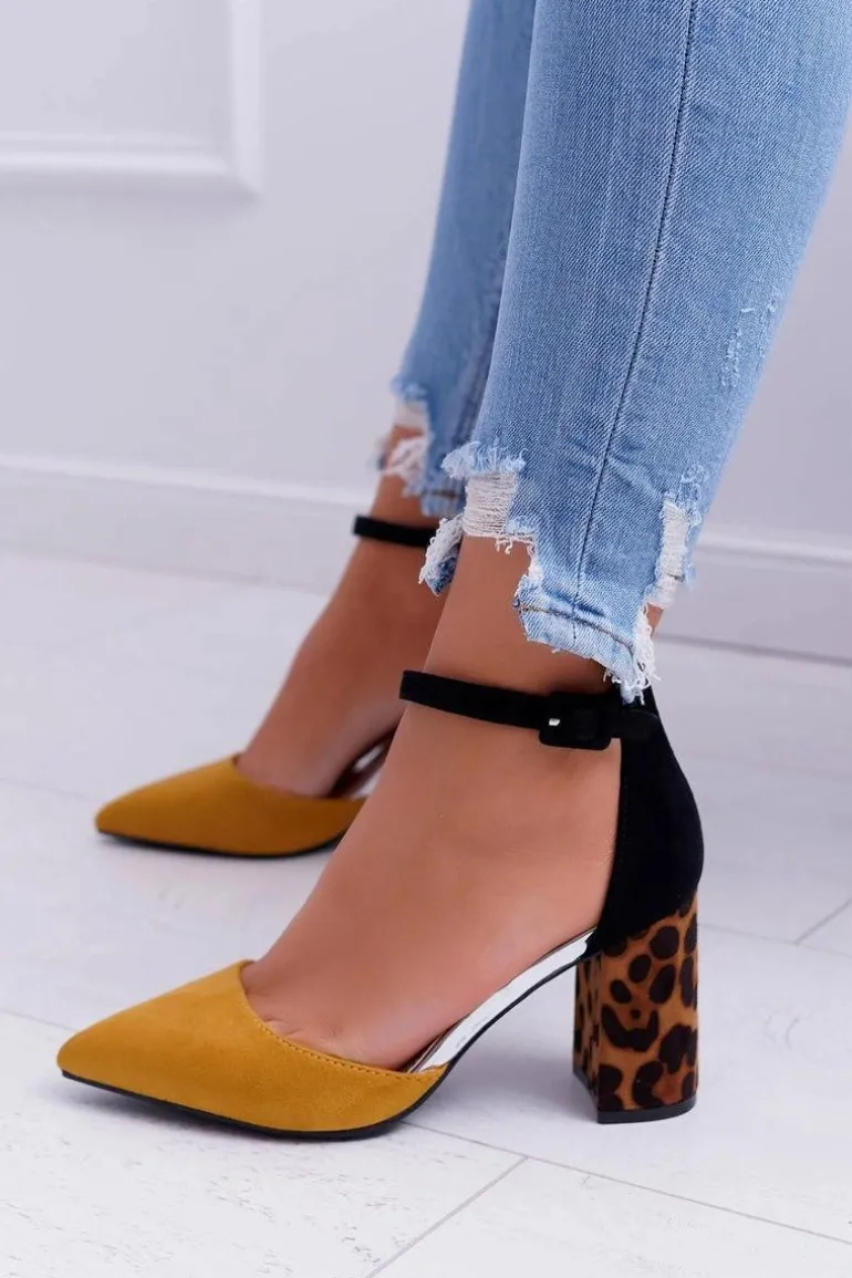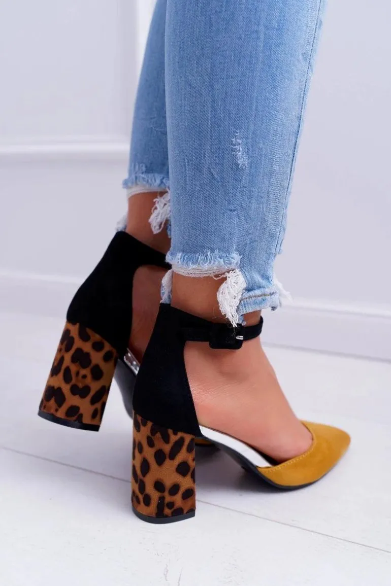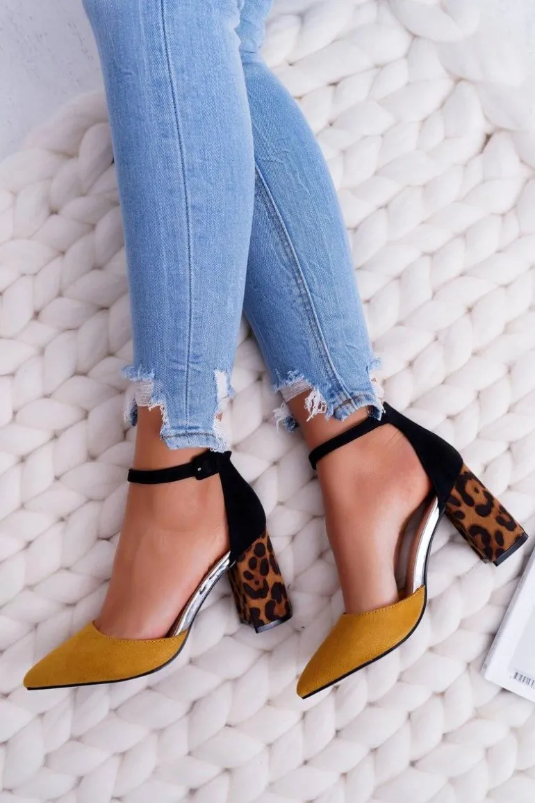 Czółenka Damskie Na Słupku Panterki Żółte Ferri