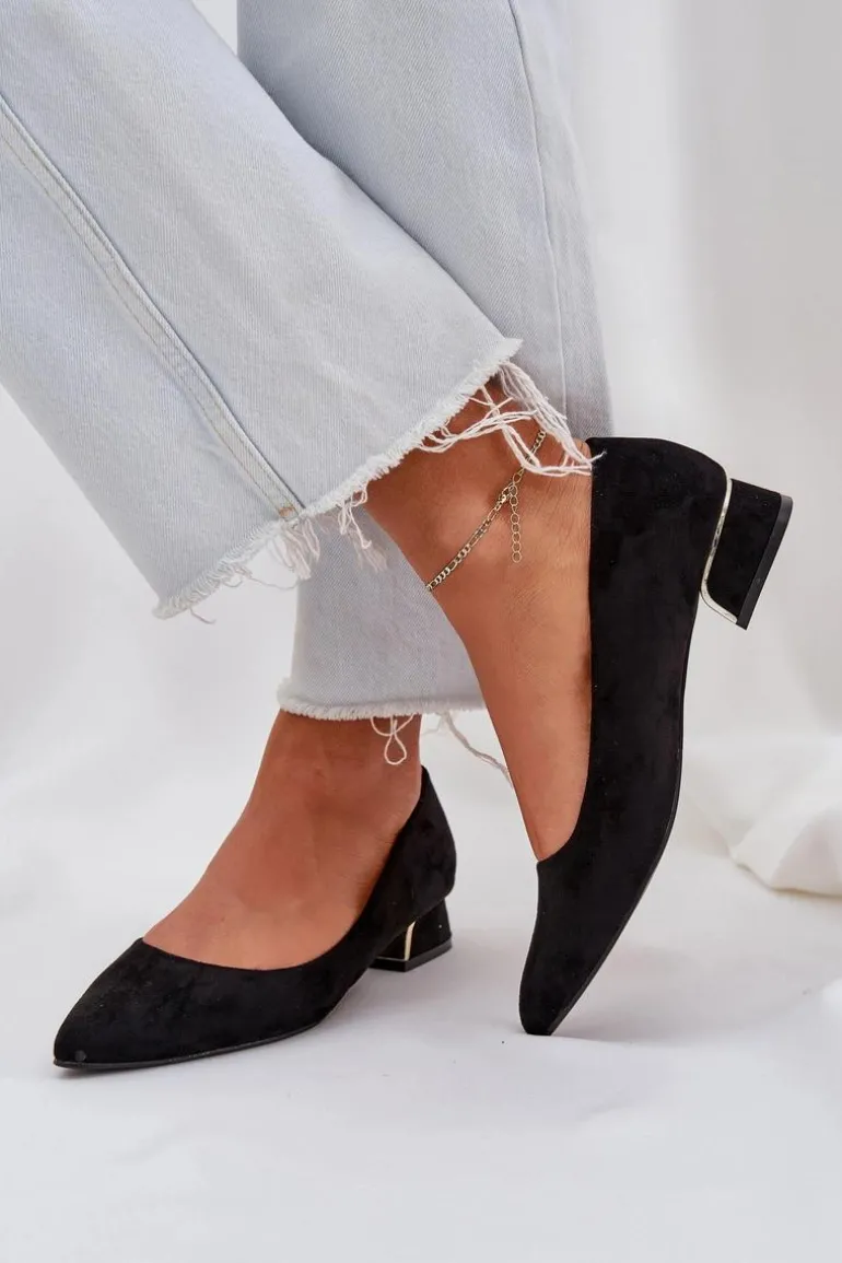 Eko zamszowe czółenka na niskim obcasie to elegancka propozycja dla kobiet ceniących komfort i styl. Szpiczaste noski nadają im wyrafinowanego charakteru, a złoty element na obcasie dodaje subtelnego blasku i podkreśla całość. Niski obcas zapewnia wygodę przez cały dzień, idealnie komponując się zarówno z codziennymi, jak i bardziej eleganckimi stylizacjami. To idealny wybór na każdą okazję, łączący nowoczesny design z klasyczną elegancją. Przy wyborze rozmiaru prosimy sugerować się tabelą rozmiarów.