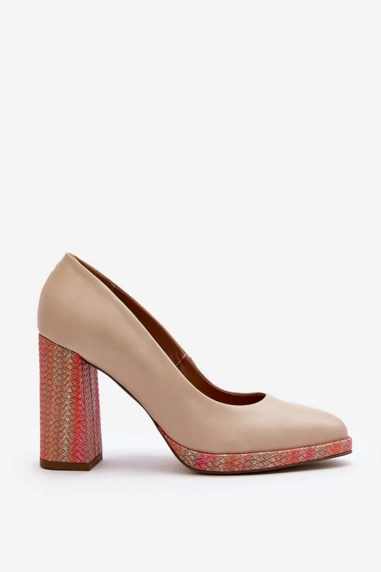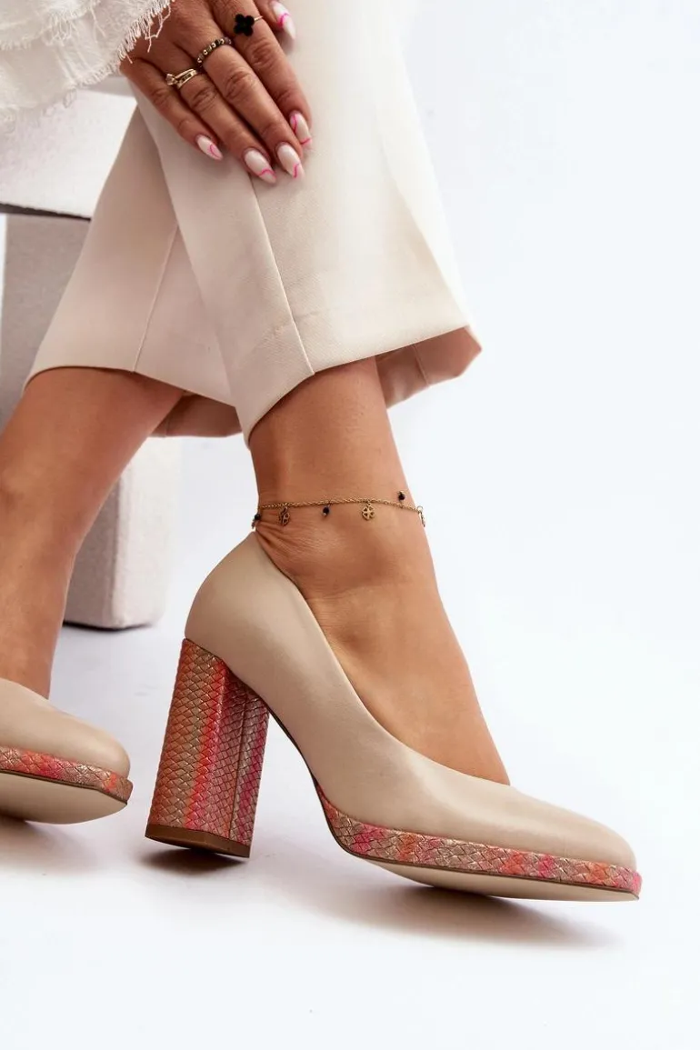 Stylowe czółenka wykonane zostały z wysokiej jakości naturalnej skóry. Osadzone na obcasie w postaci słupka. Noski zaokrąglone. Miękka wkładka oraz stabilny obcas zadbają o Twój komfort. Czółenka posiadają usztywniany zapiętek. Przy wyborze rozmiaru prosimy sugerować się tabelą rozmiarów.