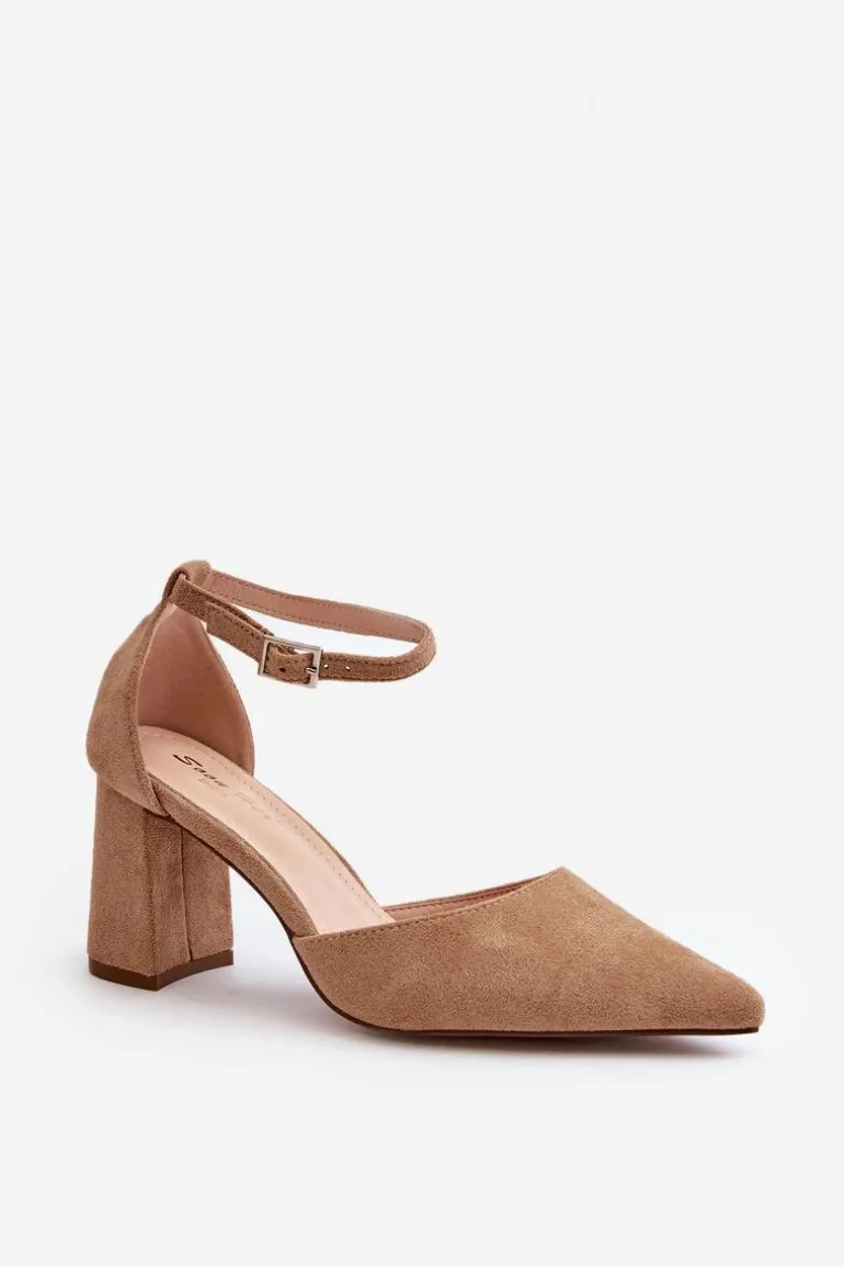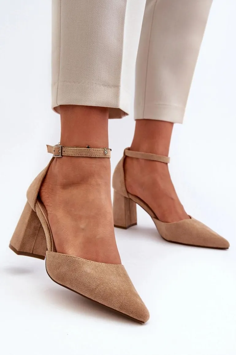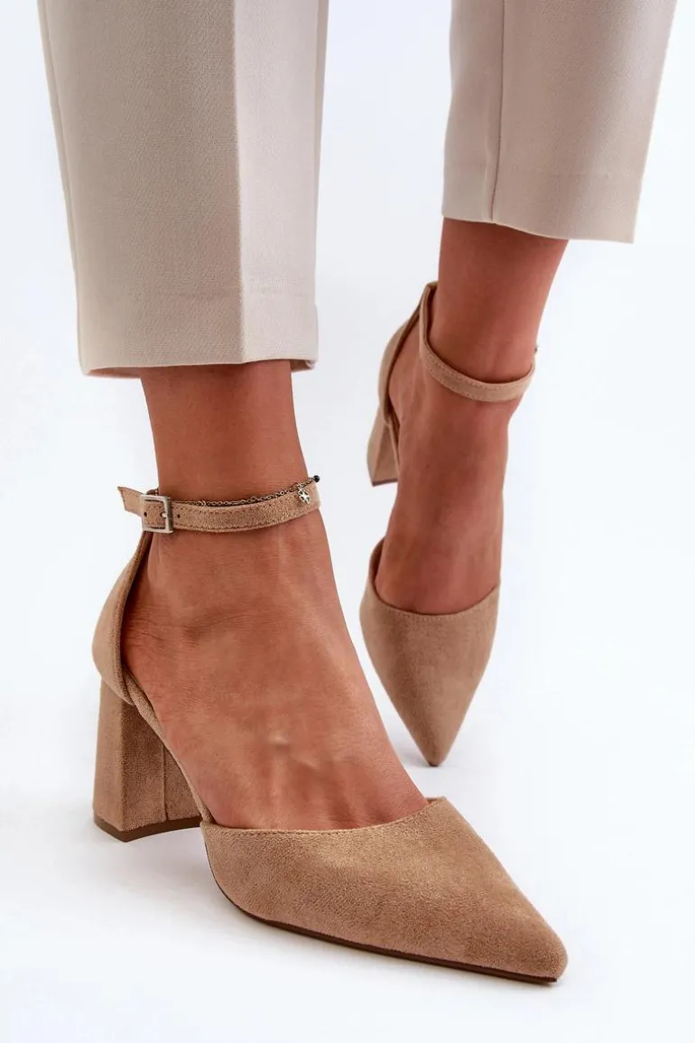 Stylowe czółenka damskie na obcasie w postaci słupka. Wykonane z eko zamszu. Noski w szpic optycznie wysmuklą nogi, a zapinanie na regulowany pasek ze sprzączką zapewni doskonałe dopasowanie. Idealne na wieczorne wyjścia oraz różne uroczystości rodzinne! Przy wyborze rozmiaru prosimy kierować się tabelą rozmiarów