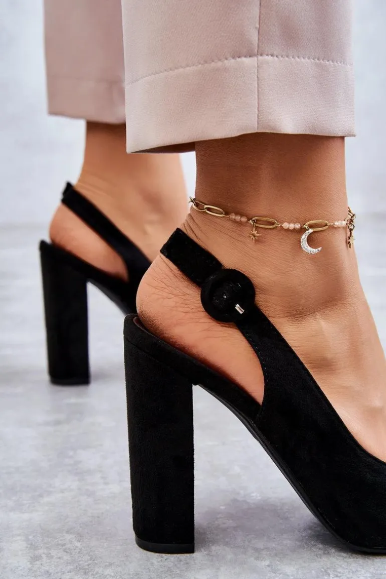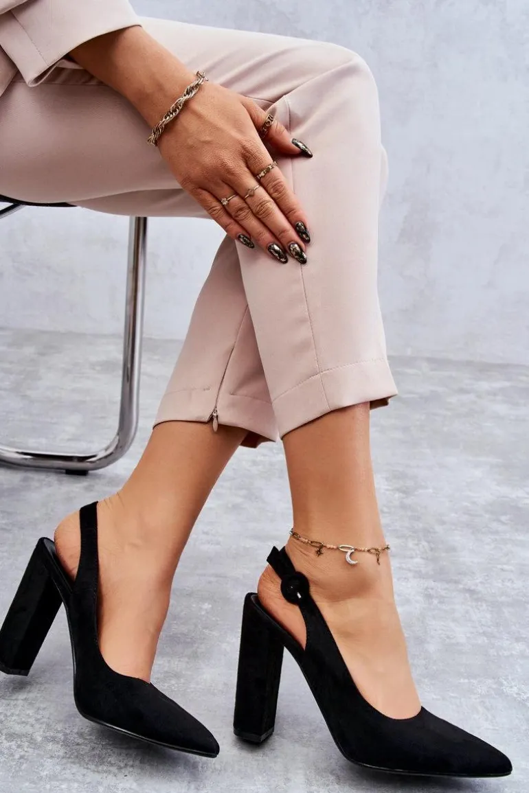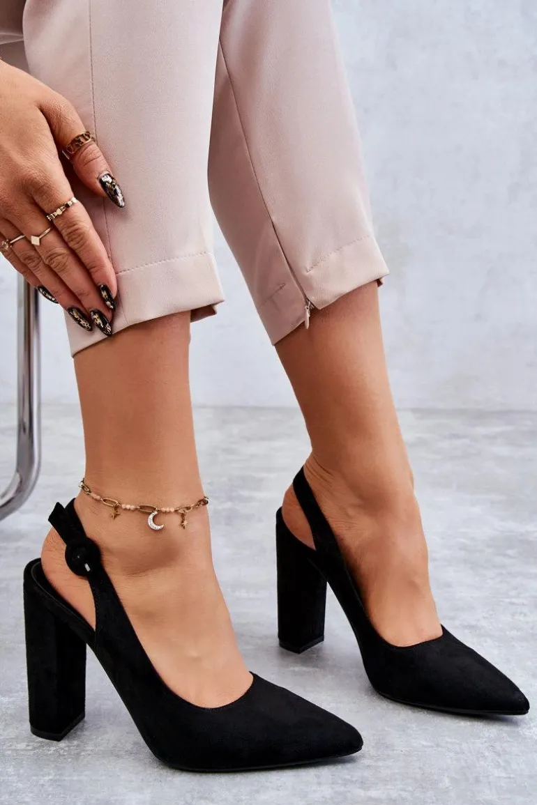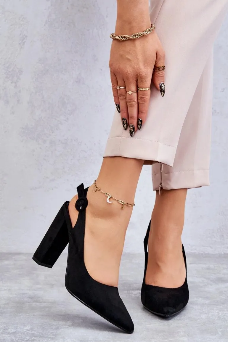 Modne czółenka na stabilnym obcasie w postaci słupka. Zapinane wokół kostki na regulowany pasek ze sprzączką. Model z noskiem w szpic. Buty te zostały wykonane z eko zamszu, natomiast wkładka z eko skóry. Dodatkowo posiadają odkrytą piętę. Idealne na wiele okazji. Przy wyborze rozmiaru prosimy sugerować się tabelą rozmiarów.