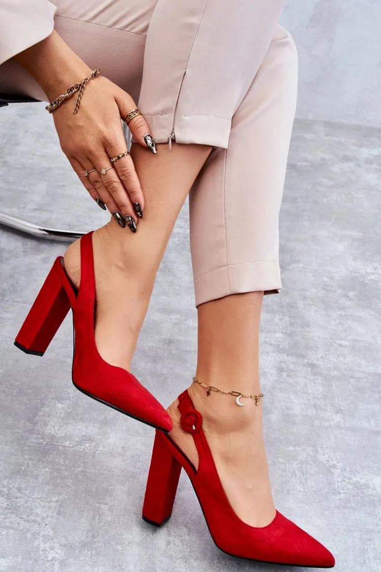 Modne czółenka na stabilnym obcasie w postaci słupka. Zapinane wokół kostki na regulowany pasek ze sprzączką. Model z noskiem w szpic. Buty te zostały wykonane z eko zamszu, natomiast wkładka z eko skóry. Dodatkowo posiadają odkrytą piętę. Idealne na wiele okazji. Przy wyborze rozmiaru prosimy sugerować się tabelą rozmiarów.