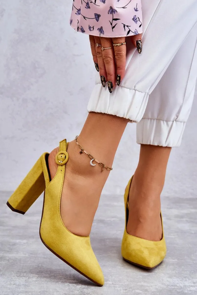 Modne czółenka na stabilnym obcasie w postaci słupka. Zapinane wokół kostki na regulowany pasek ze sprzączką. Model z noskiem w szpic. Buty te zostały wykonane z eko zamszu, natomiast wkładka z eko skóry. Dodatkowo posiadają odkrytą piętę. Idealne na wiele okazji. Przy wyborze rozmiaru prosimy sugerować się tabelą rozmiarów.