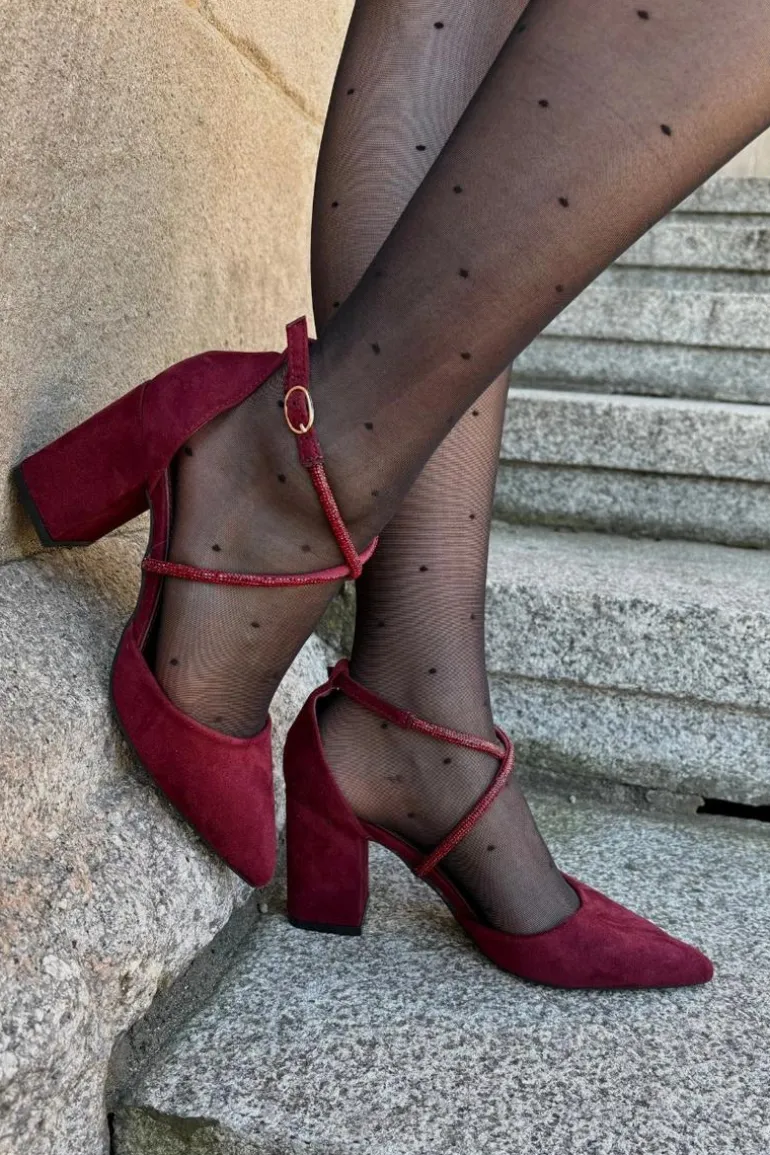 Czółenka damskie wykonane z eko zamszu. Osadzone na obcasie typu słupek. Model ten wyróżnia się przeplatającymi paseczkami, które ozdobione zostały cyrkoniami, które z pewnością przyciągną uwagę i nadają wyjątkowego blasku. Noski w szpic podkreślają ich elegancki wygląd, a zapinane na sprzączkę, zapewniają idealne dopasowanie do stopy. Te czółenka będą doskonałym wyborem na specjalne okazje, dodając każdej stylizacji szyku i odrobiny glamour. Przy wyborze rozmiaru prosimy sugerować się tabelą rozmiarów.