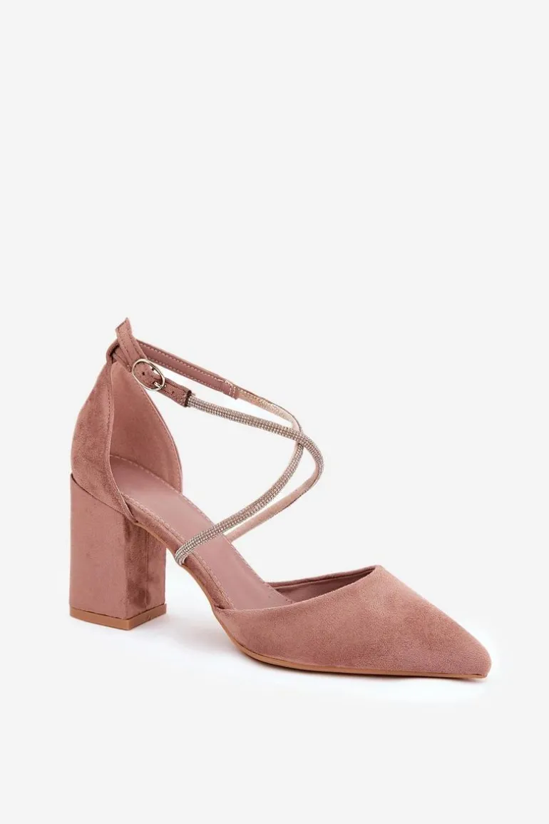 Czółenka damskie wykonane z eko zamszu. Osadzone na obcasie typu słupek. Model ten wyróżnia się przeplatającymi paseczkami, które ozdobione zostały cyrkoniami, które z pewnością przyciągną uwagę i nadają wyjątkowego blasku. Noski w szpic podkreślają ich elegancki wygląd, a zapinane na sprzączkę, zapewniają idealne dopasowanie do stopy. Te czółenka będą doskonałym wyborem na specjalne okazje, dodając każdej stylizacji szyku i odrobiny glamour. Przy wyborze rozmiaru prosimy sugerować się tabelą rozmiarów.