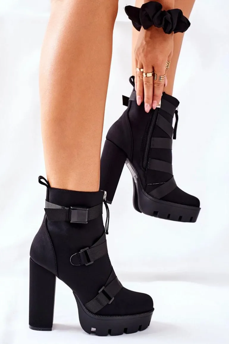 Przepiękne i modne botki są na wyciągnięcie ręki. Model na wysokim słupku oraz platformie, dzięki której wysokość słupka nie będzie aż tak odczuwalna. Zakładanie ułatwi wszyty na boku suwak. Modne zdobienie w postaci pasków oraz dodatkowego suwaka z przodu cholewki. Przy wyborze rozmiaru prosimy sugerować się tabelą rozmiarów.