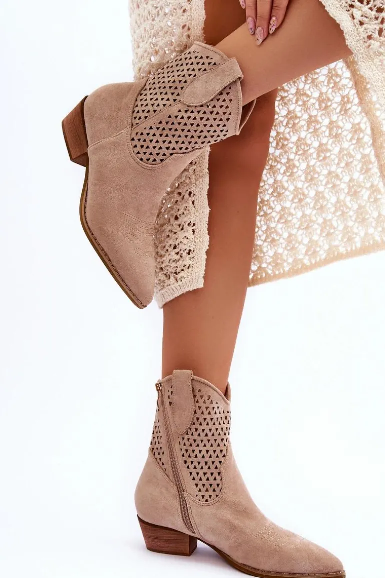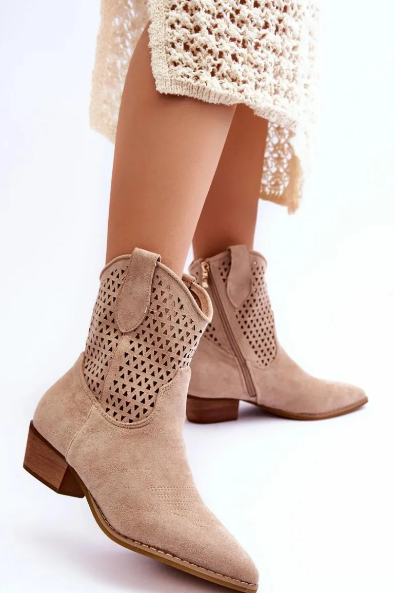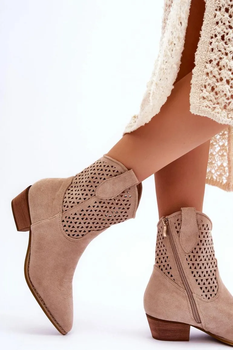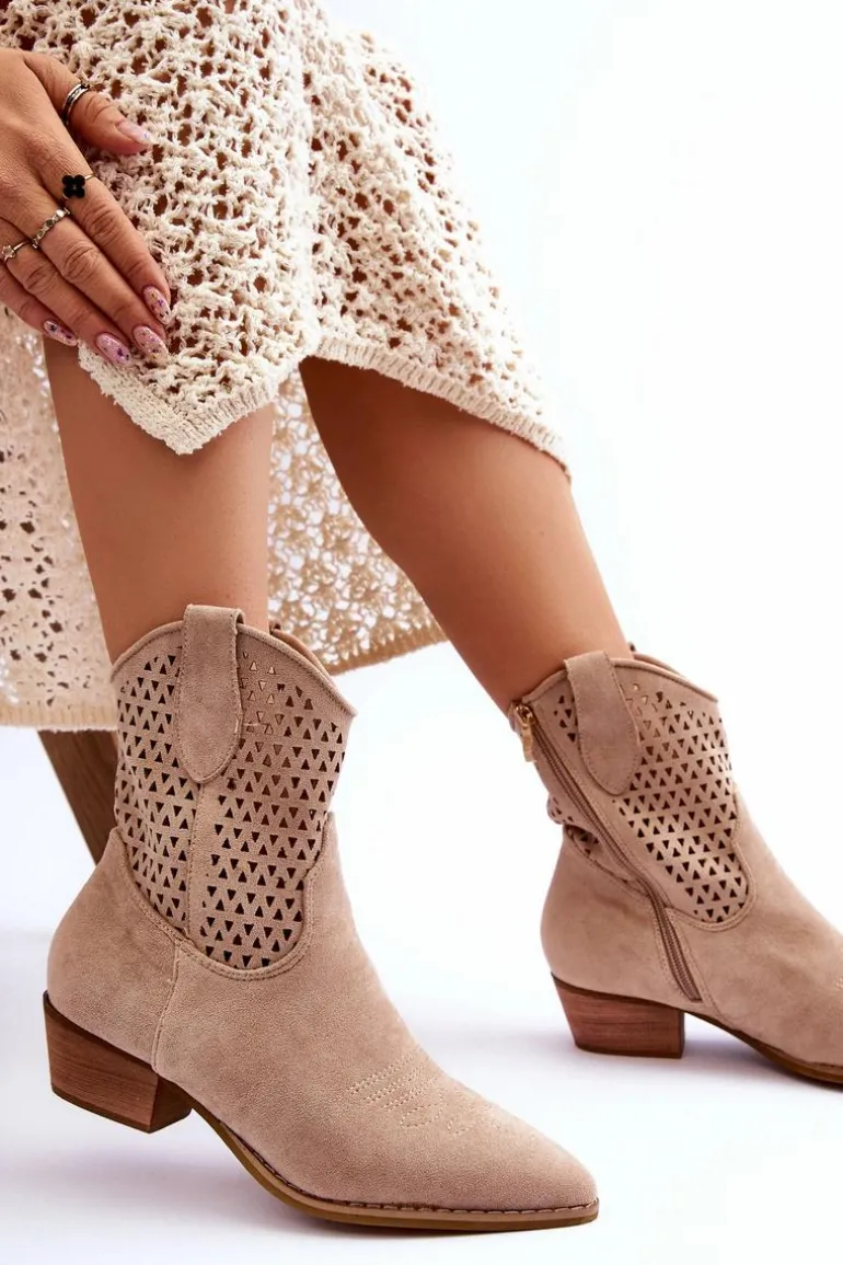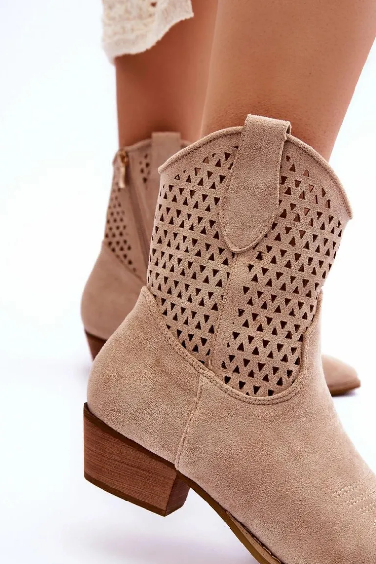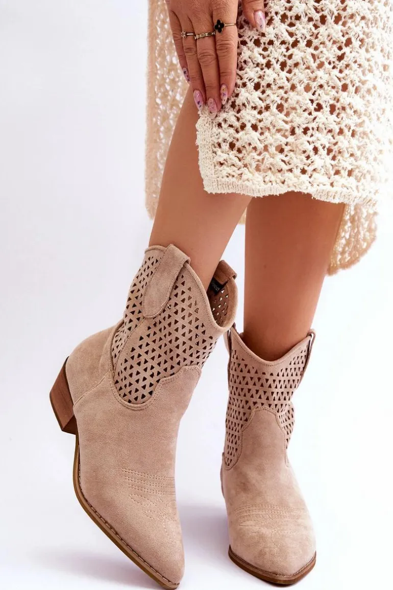 Świetne, damskie botki wykonane z ekologicznego zamszu z cholewką w ażurowy wzorek. Kowbojki posiadają usztywniany zapiętek oraz materiałową wkładkę. Osadzone na płaskim obcasie z noskiem w szpic. Z przodu posiadają ozdobne przeszycie. Model ten jest zapinany na suwak z boku cholewki. Koniecznie powinnaś je mieć! Przy wyborze rozmiaru prosimy sugerować się tabelą rozmiarów.