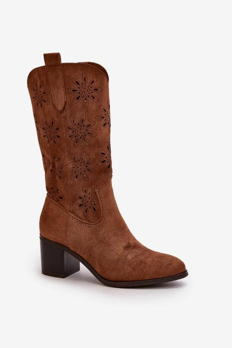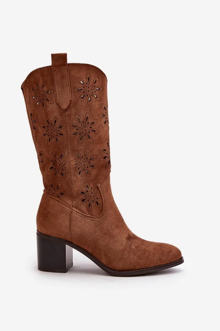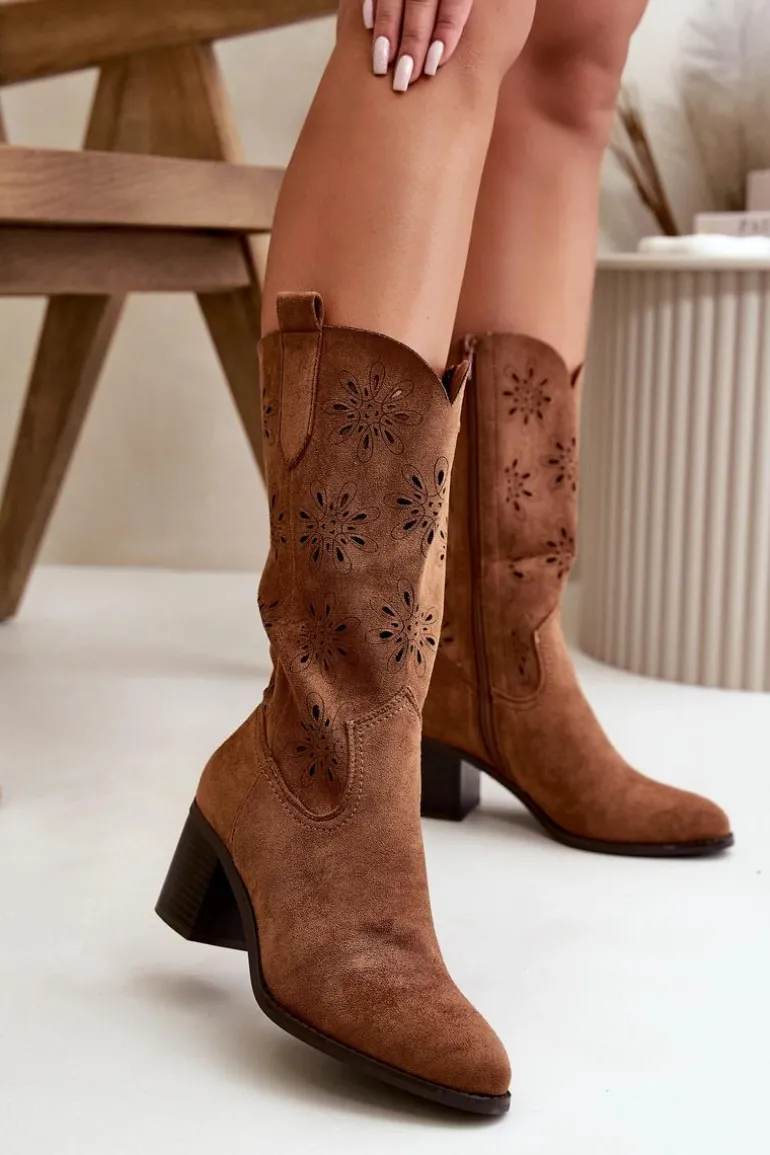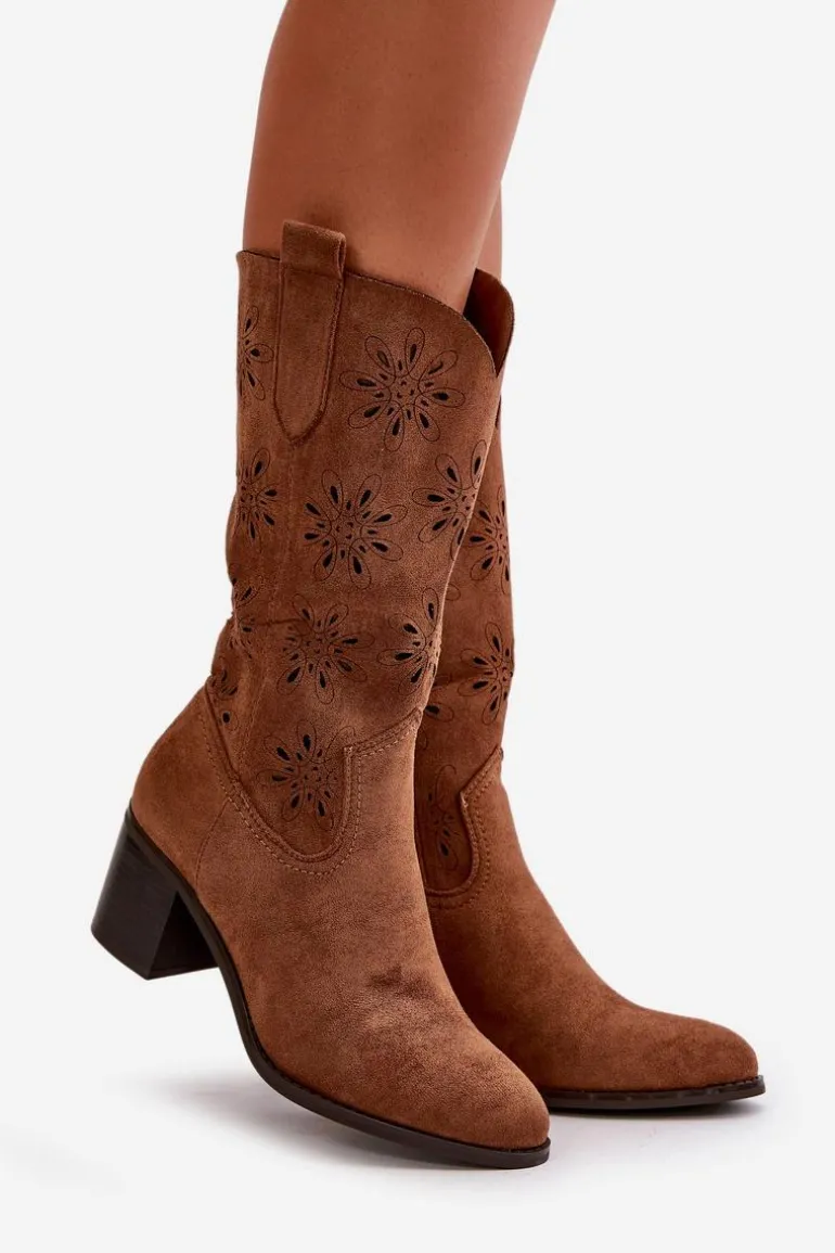Damskie Ażurowe Kozaki Do Połowy Łydki Z Eko Zamszu Brązowe Nevilos