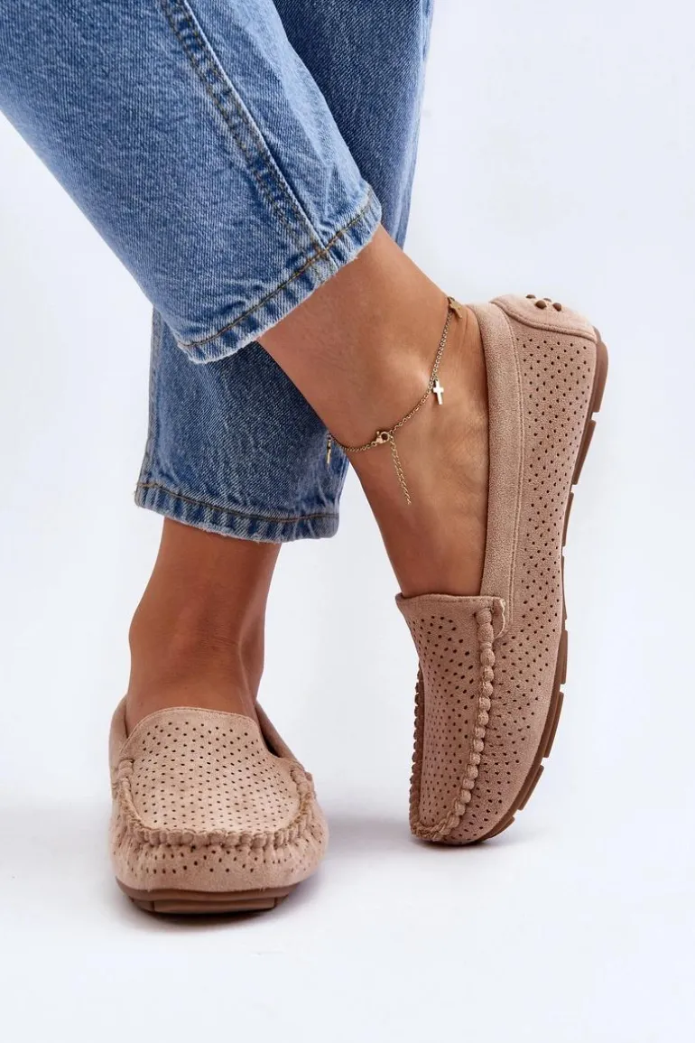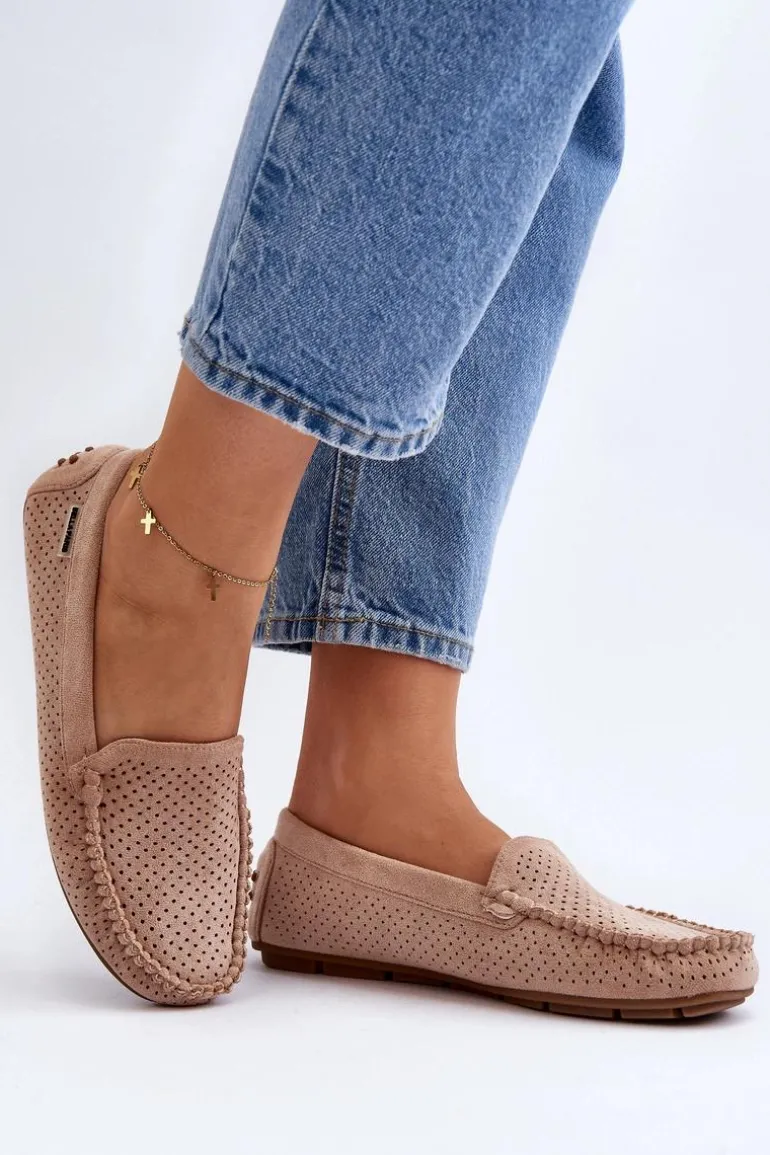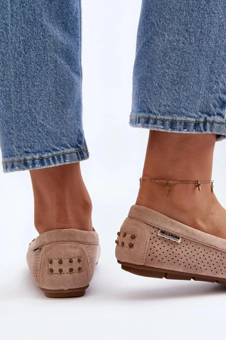 Ażurowe mokasyny damskie wykonane z eko zamszu. Osadzone na podeszwie z gumowego tworzywa. Noski zaokrąglone. Model ten posiada miękką, skórzaną wkładkę, która zapewni wygodę podczas noszenia. Z pewnością świetnie będą prezentować się w wielu stylizacjach! Przy wyborze rozmiaru prosimy sugerować się tabelą rozmiarów.