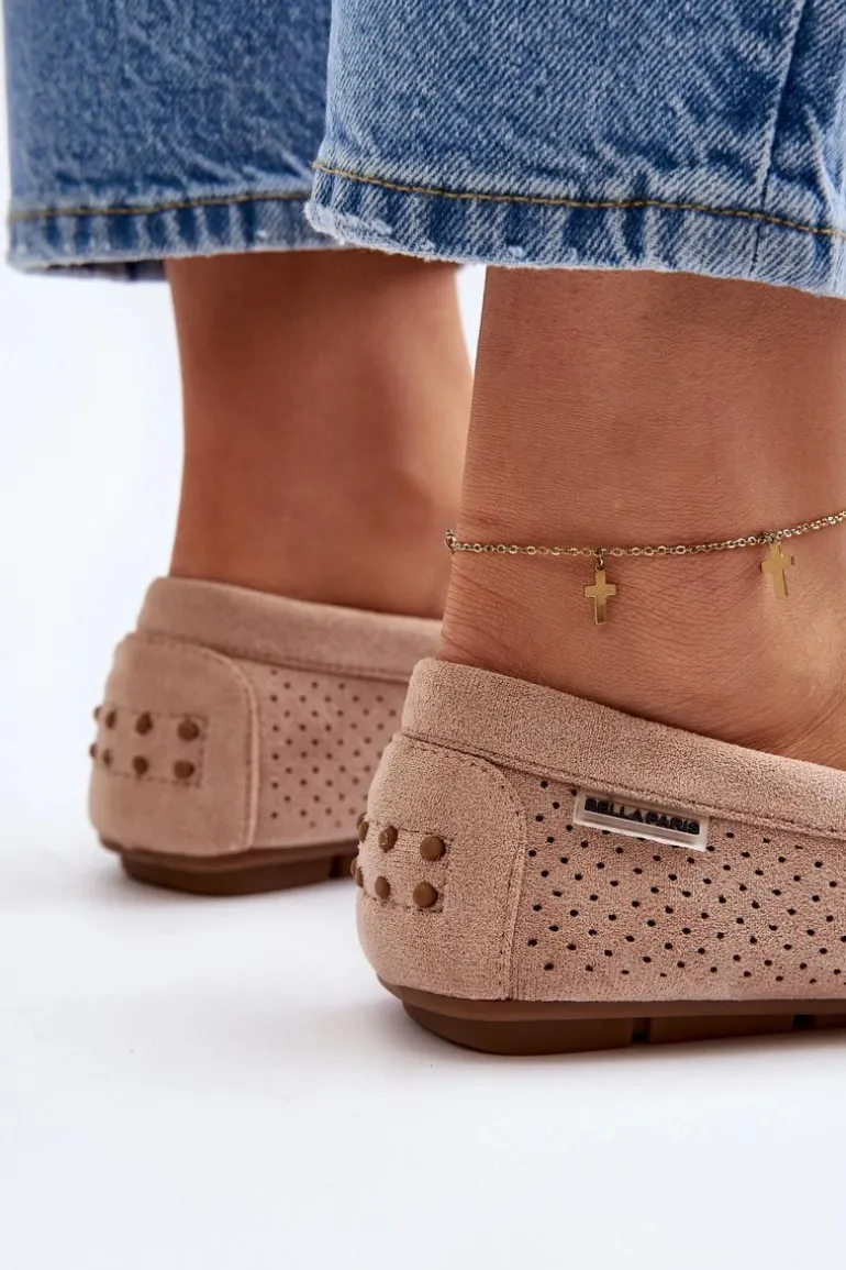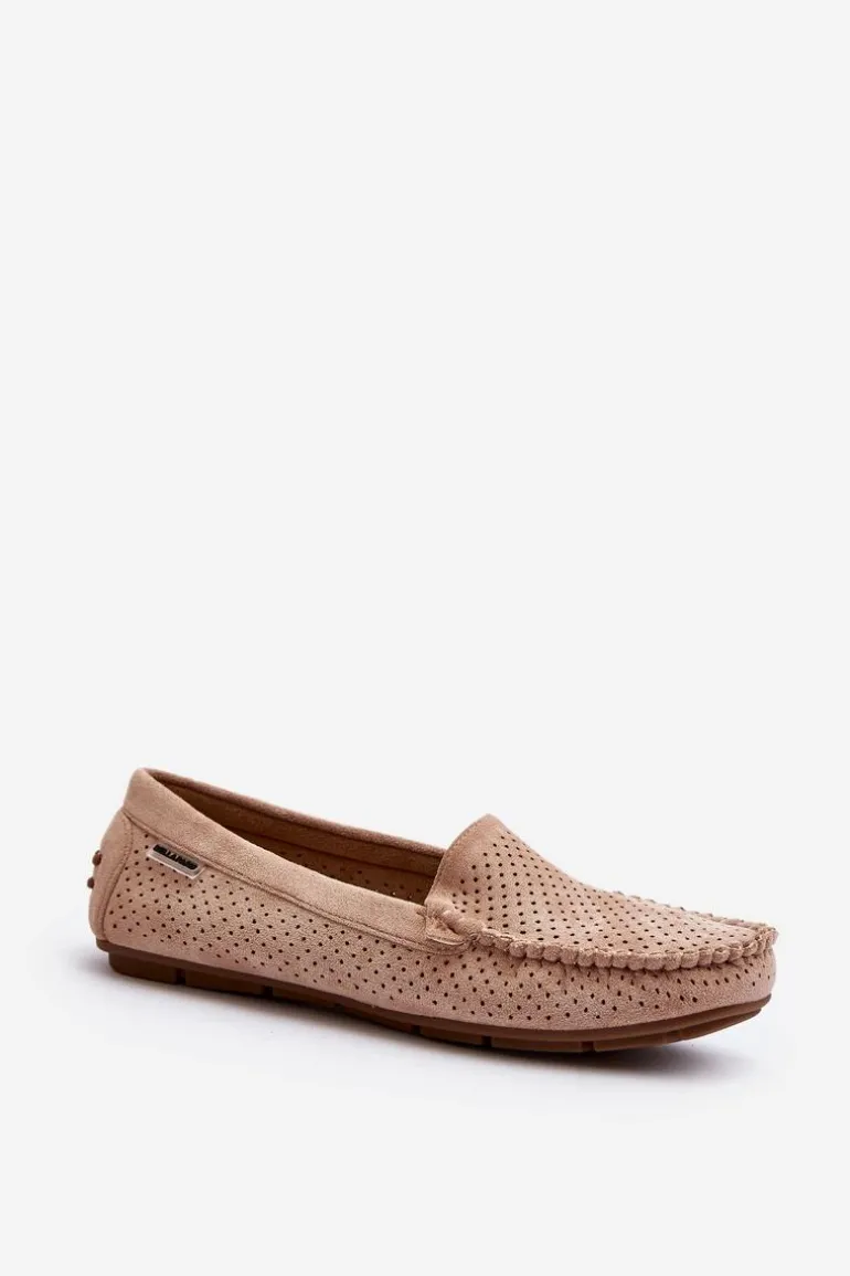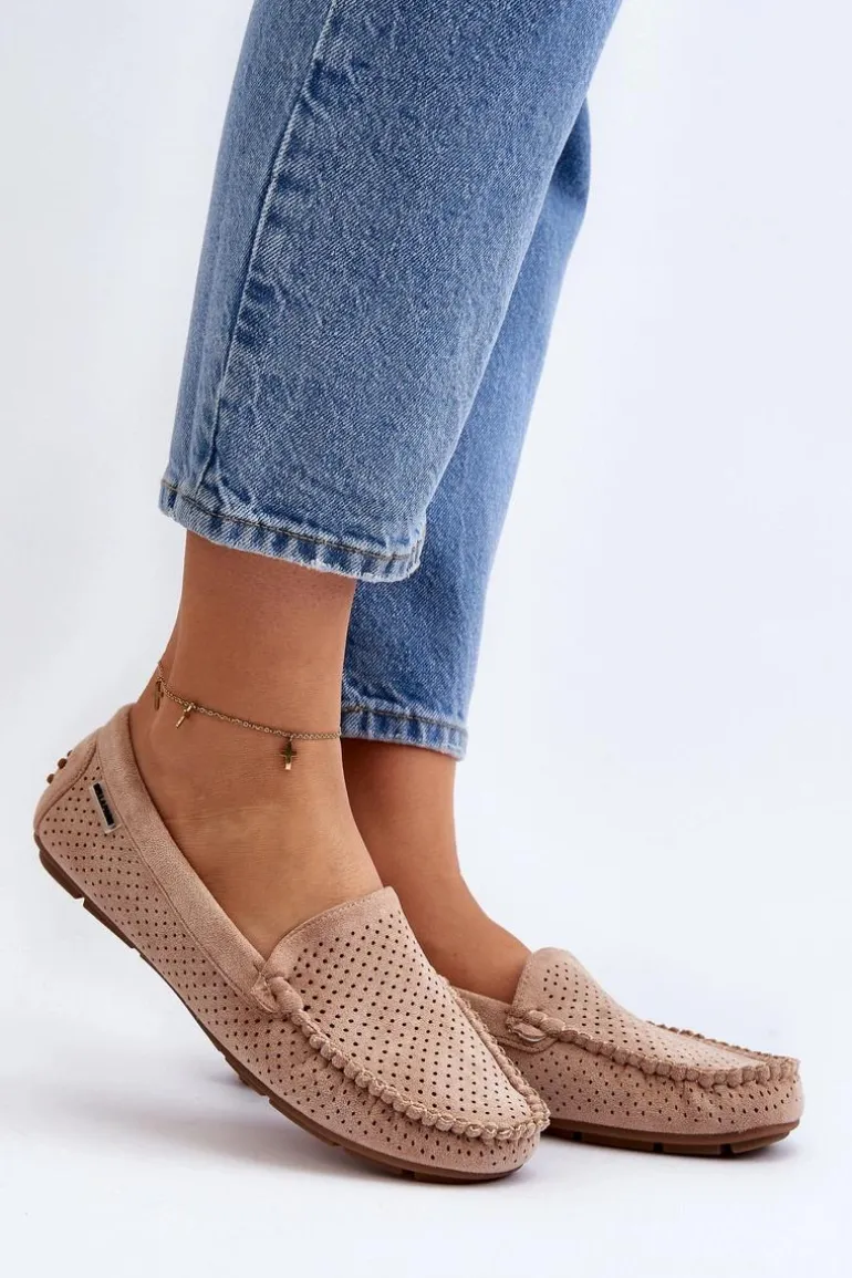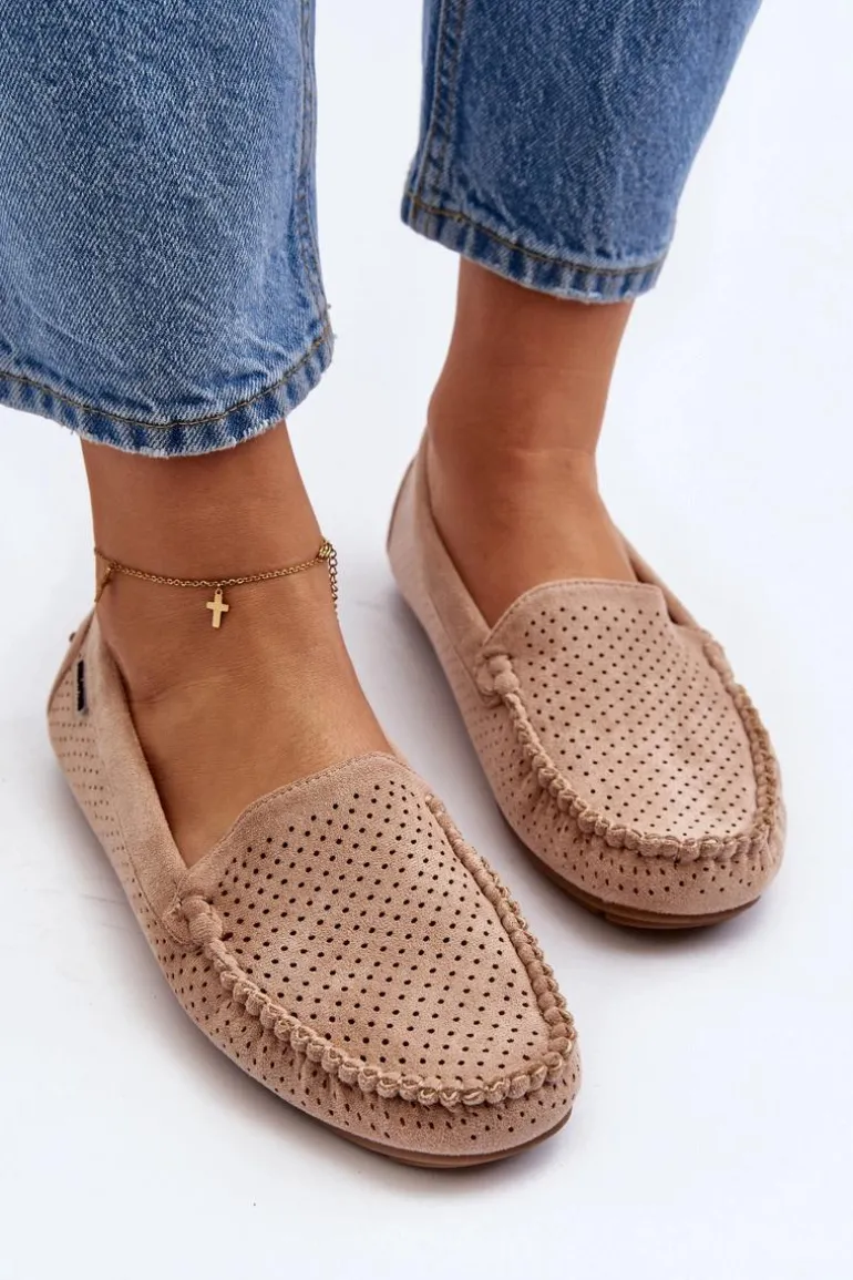 Ażurowe mokasyny damskie wykonane z eko zamszu. Osadzone na podeszwie z gumowego tworzywa. Noski zaokrąglone. Model ten posiada miękką, skórzaną wkładkę, która zapewni wygodę podczas noszenia. Z pewnością świetnie będą prezentować się w wielu stylizacjach! Przy wyborze rozmiaru prosimy sugerować się tabelą rozmiarów.