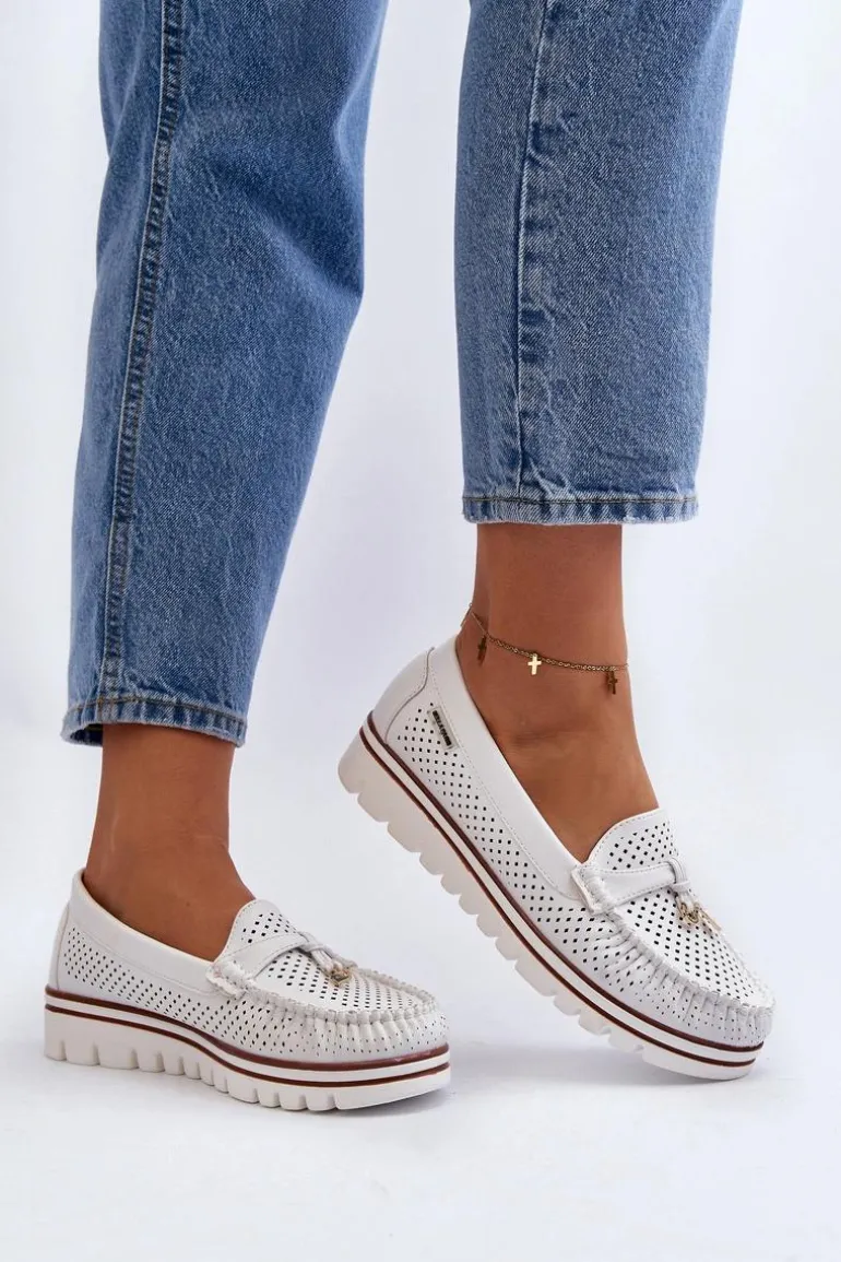 Ażurowe mokasyny wykonane z eko skóry. Osadzone na platformie. Miękka wkładka ze skóry naturalnej zapewni wygodę podczas noszenia. Świetny model do wielu wiosenno-letnich stylizacji! Przy wyborze rozmiaru prosimy sugerować się tabelą rozmiarów.