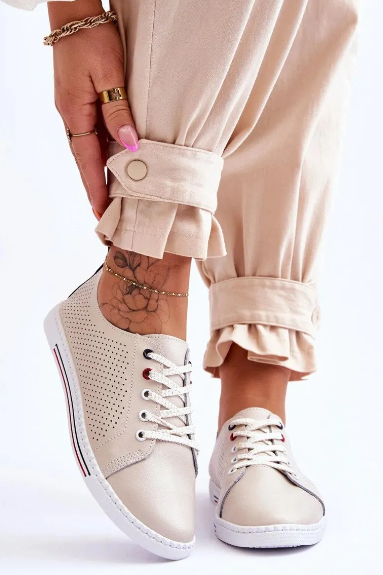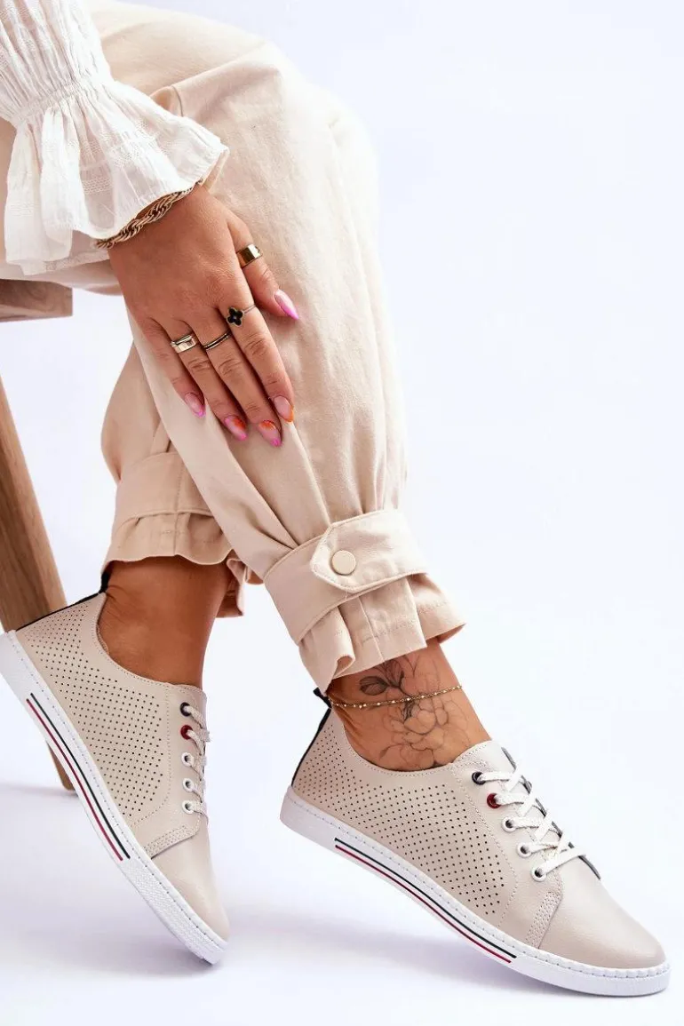Niskie trampki damskie zostały wykonane z naturalnej skóry. Ażurowa cholewka świetnie sprawdzi się w cieplejsze dni, gdyż zapewnia odpowiednią wentylację obuwia. Model posiada sznurowadła z ozdobną nicią. Tenisówki osadzono na niskiej platformie z gumową, antypoślizgową podeszwą. Wkładka Comfort została wykonana także z naturalnej skóry. Przy wyborze rozmiaru prosimy sugerować się tabelą rozmiarów.