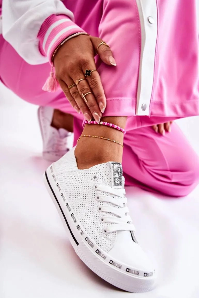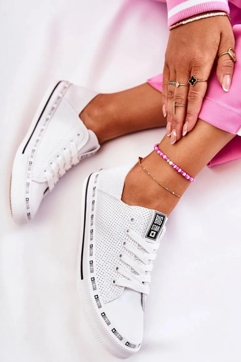 Damskie trampki polskiej marki Big Star. Obuwie wykonane jest z wysokiej jakości ażurowej eko skóry. O Twój komfort zadba miękka, materiałowa wkładka oraz logowana, antypoślizgowa podeszwa. Koniecznie sprawdź całą naszą kolekcję butów BIG STAR. Przy wyborze rozmiaru prosimy kierować się tabelą rozmiarów.