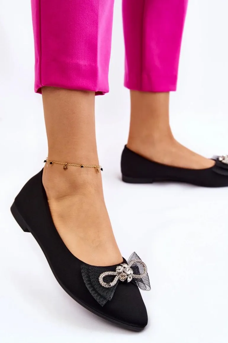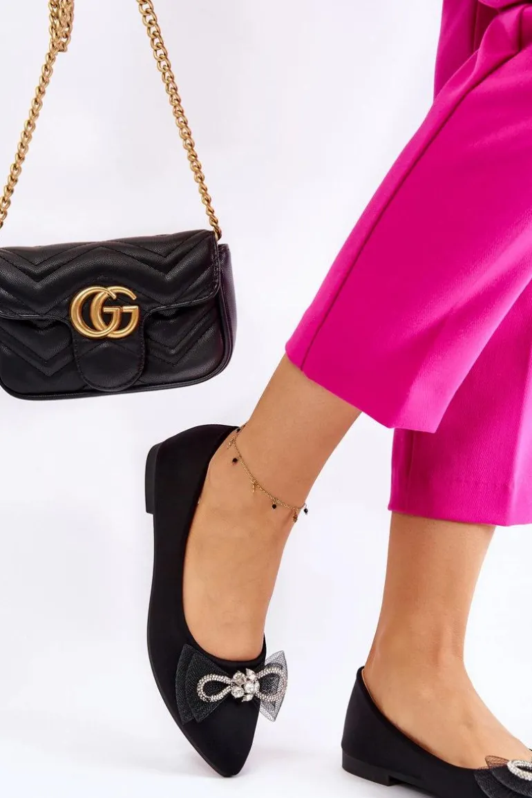 Eleganckie, damskie baleriny zostały wykonane z materiału tekstylnego. Model ten posiada na przodzie kokardę oraz dżety imitujące cyrkonie. Nosek w szpic. Baleriny to buty, z którymi stworzysz mnóstwo stylizacji. Będą idealne na różne, ważne okazje. Miękka wkładka wykonana z eko skóry zapewni wygodę podczas użytkowania. Przy wyborze rozmiaru prosimy sugerować się tabelą rozmiarów.