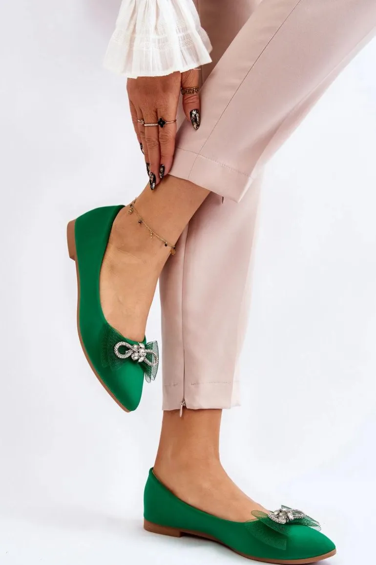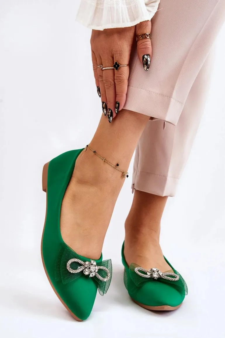 Eleganckie, damskie baleriny zostały wykonane z materiału tekstylnego. Model ten posiada na przodzie kokardę oraz dżety imitujące cyrkonie. Nosek w szpic. Baleriny to buty, z którymi stworzysz mnóstwo stylizacji. Będą idealne na różne, ważne okazje. Miękka wkładka wykonana z eko skóry zapewni wygodę podczas użytkowania. Przy wyborze rozmiaru prosimy sugerować się tabelą rozmiarów.