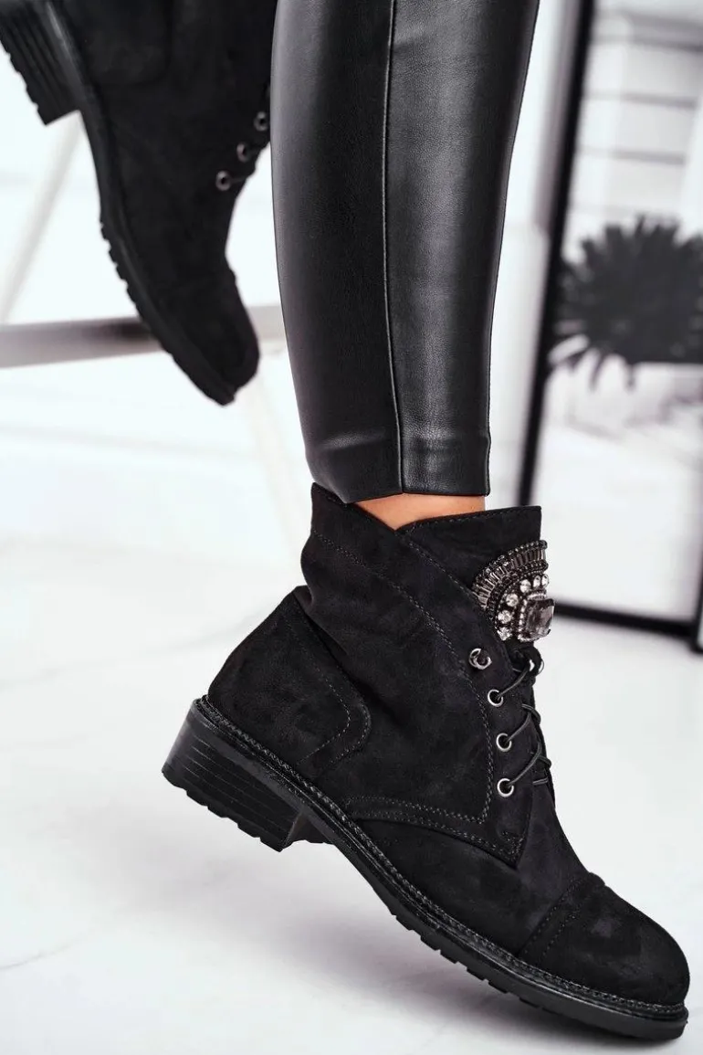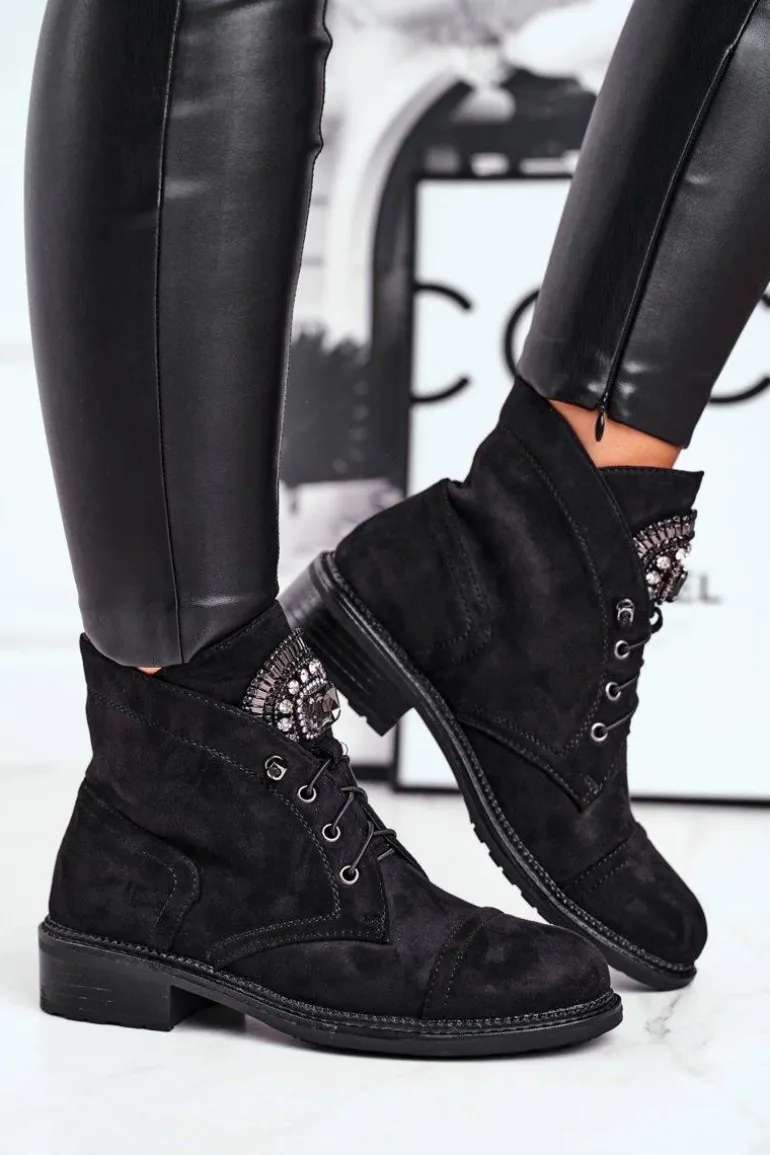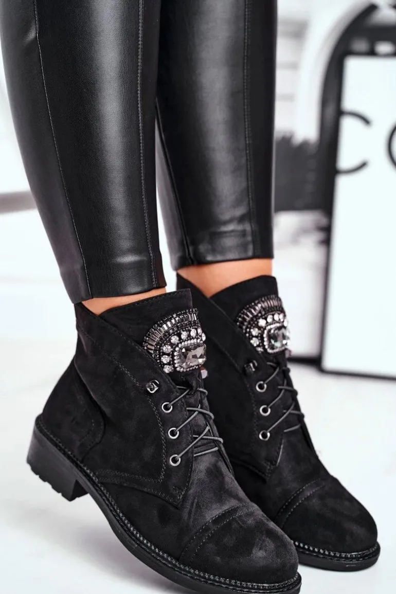 Damskie Botki Ciepłe Zamszowe Kryształki Czarne Hondus
