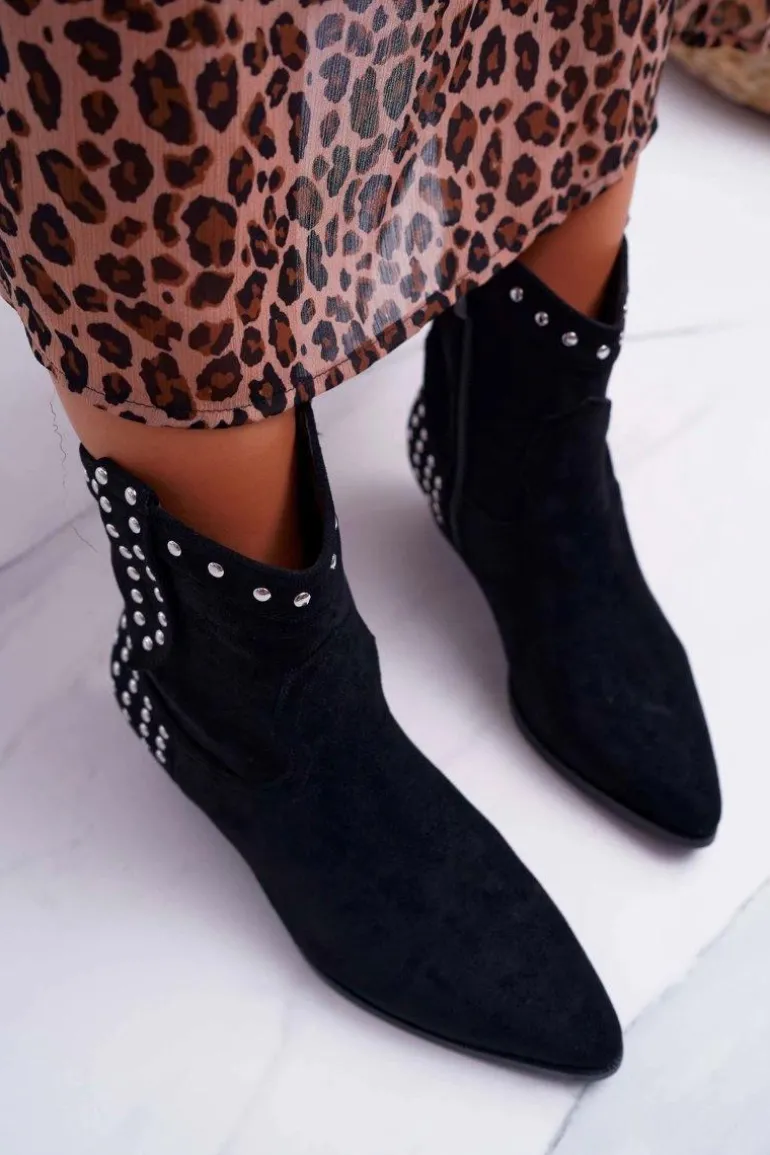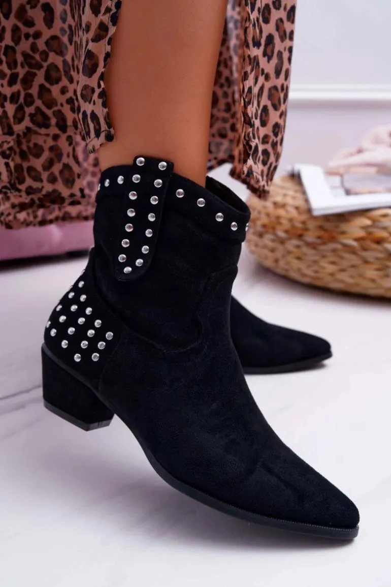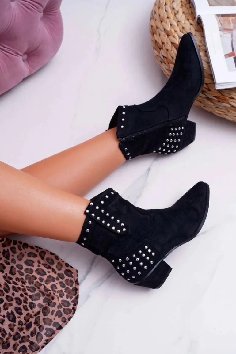 Przepiękne botki z noskiem w szpic w ciekawej odsłonie ze srebrnymi nitami. Klasyczny kolor w pięknej wersji z eko-zamszu. Te botki pasują dosłownie do wszystkiego. Kowbojki na płaskim obcasie to gwarancja komfortu i wyszukanego stylu. Zapinanie na suwak ułatwi zakładanie. Przy wyborze rozmiaru prosimy sugerować się tabelą rozmiarów, która dostępna jest po najechaniu bądź kliknięciu w dany rozmiar.