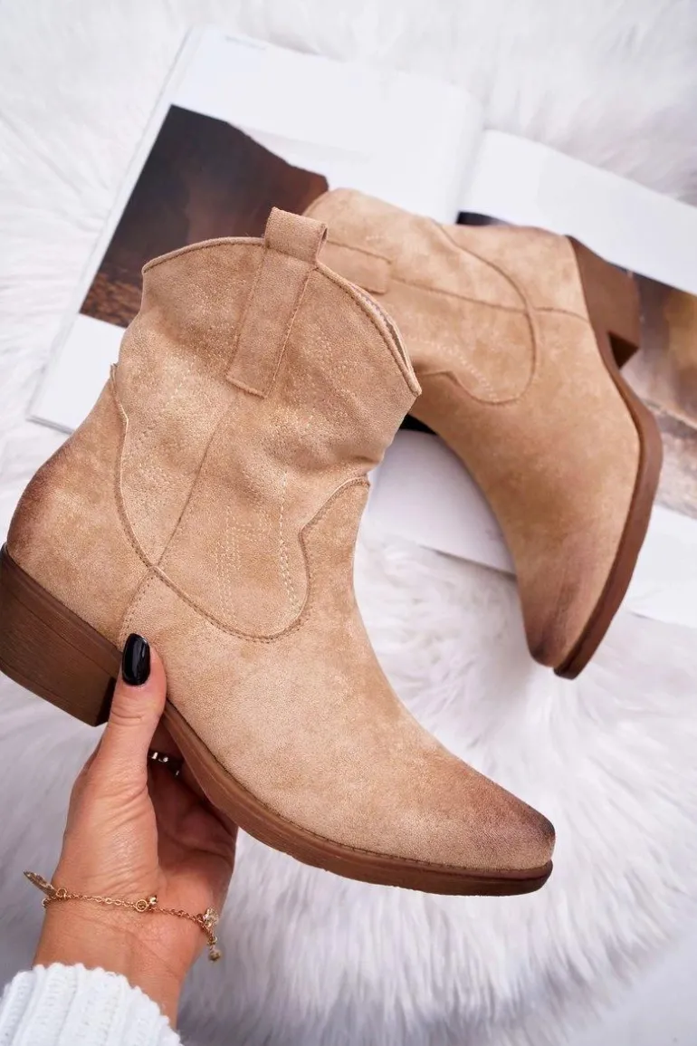 Damskie Botki Kowbojki Zamszowe Beżowe Ferders