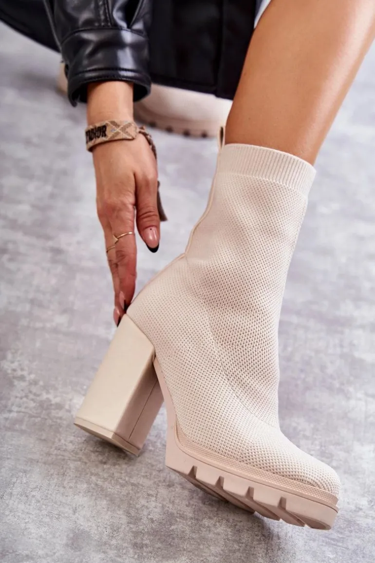 Modne botki z elastyczną cholewką za kostkę wykonaną z materiału. Na wysokości stopy są ocieplane kocem obuwniczym. Osadzone na obcasie w postaci masywnego słupka oraz platformie ze żłobieniami. Zapiętek jest usztywniany. Model ten świetnie będzie prezentować się zarówno z sukienkami, jak i jeansami. Dodatkowo buty posiadają bootstrapa, czyli pętelkę ułatwiającą zakładanie i ściąganie obuwia. Przy wyborze rozmiaru prosimy sugerować się tabelą rozmiarów.