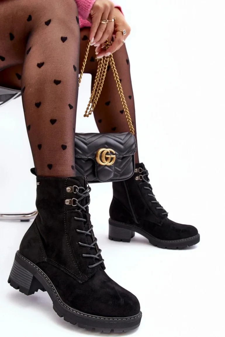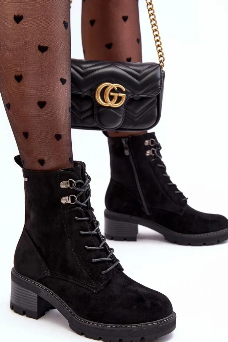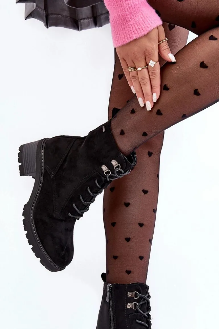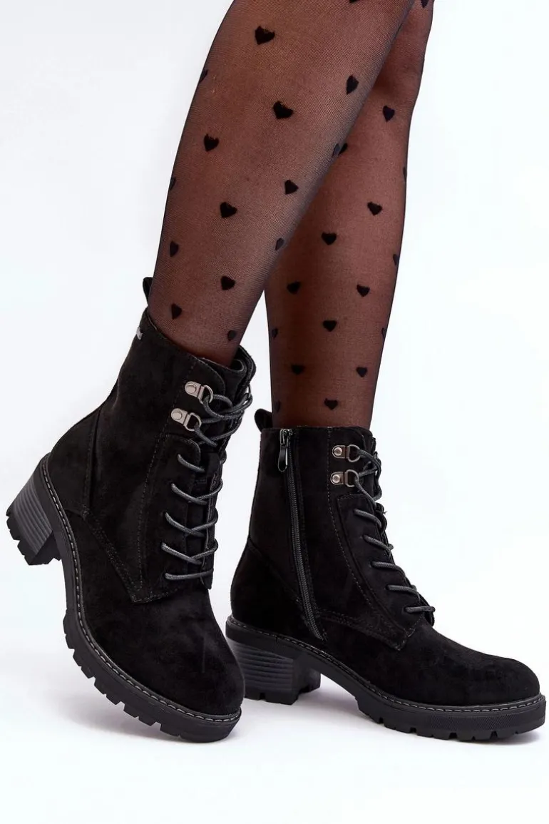 Botki damskie wykonane z eko zamszu. Osadzone na niskim, stabilnym obcasie. Zapinane z boku cholewki na suwak. Z przodu sznurowanie. Środek ocieplony kocem obuwniczym. Noski zaokrąglone. Model ten będzie idealnym uzupełnieniem jesienno-zimowych stylizacji! Przy wyborze rozmiaru prosimy sugerować się tabelą rozmiarów.
