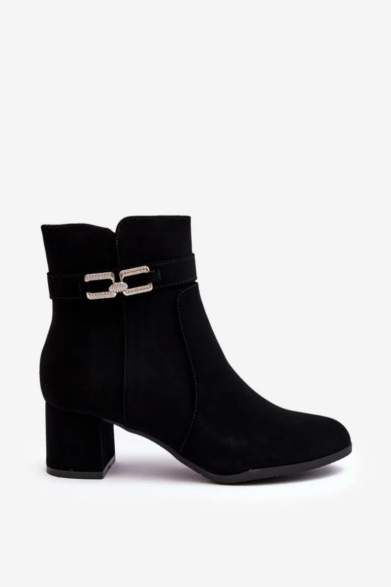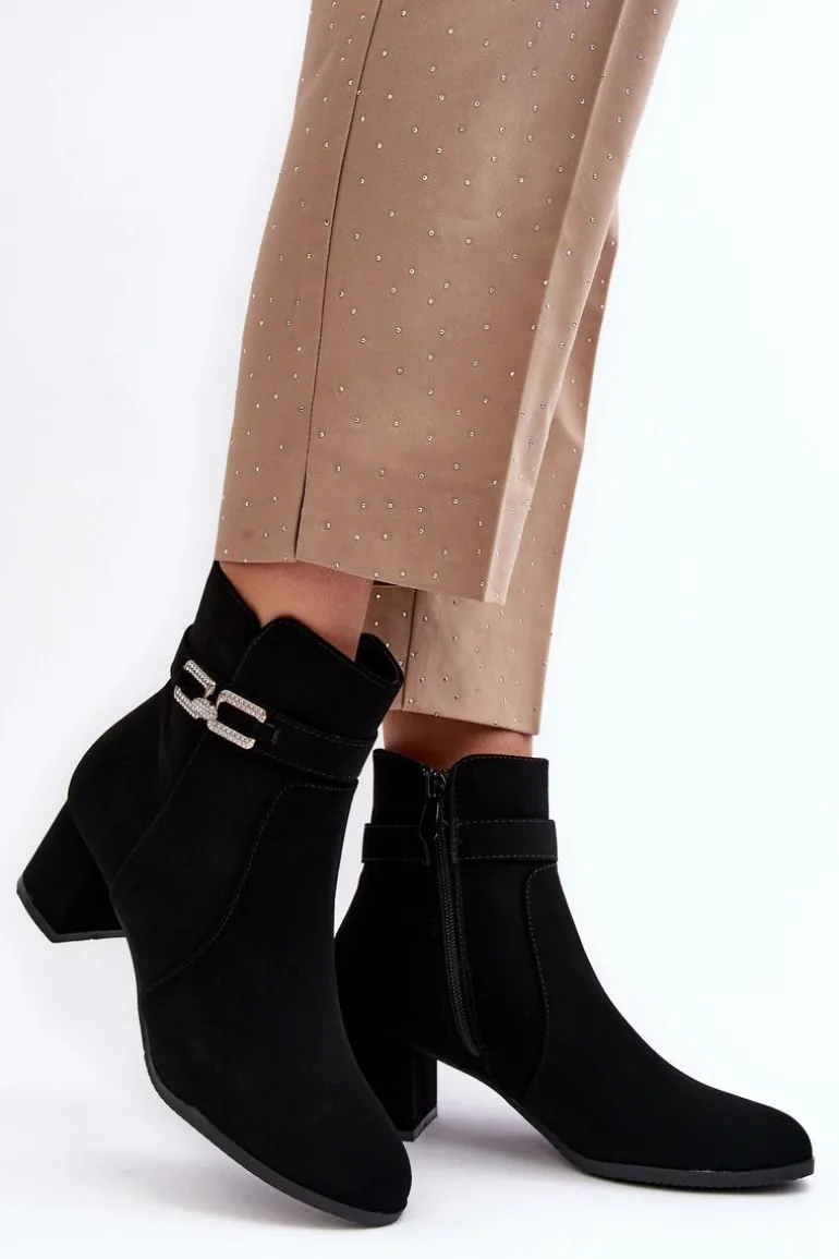 Damskie botki z cholewką za kostkę wykonane z eko skóry. Osadzone na niskim słupku. Noski zaokrąglone. Zapinane suwakiem z boku. Na cholewce pasek z ozdobą. Klasyczny model, idealny do wielu jesiennych stylizacji! Przy wyborze rozmiaru prosimy sugerować się tabelą rozmiarów.