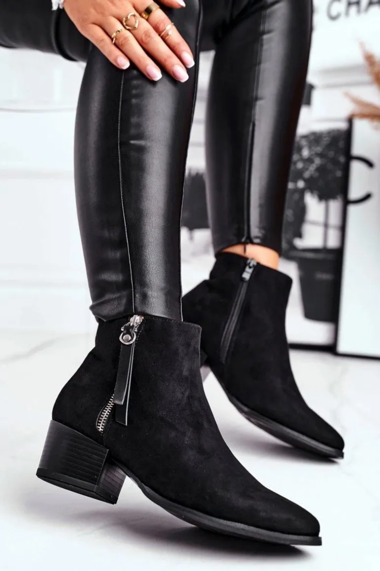Jesienno-zimowe buty powinny być praktyczne, a takie właśnie są nasze botki z ociepleniem wewnątrz. Delikatny słupek unosi sylwetkę oraz pięknie uzupełnia tę klasyczną stylistykę. Wierzch został wykonany z ekologicznego zamszu, więc dopasowanie do stylizacji nie będzie problemem. Dołącz do grona zachwyconych klientek i ciesz się nową parą butów! Przy wyborze rozmiaru prosimy sugerować się tabelą rozmiarów.