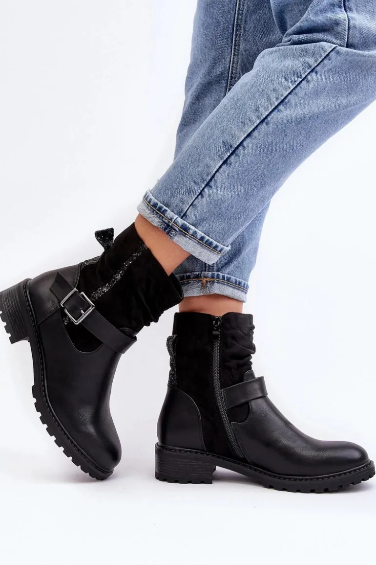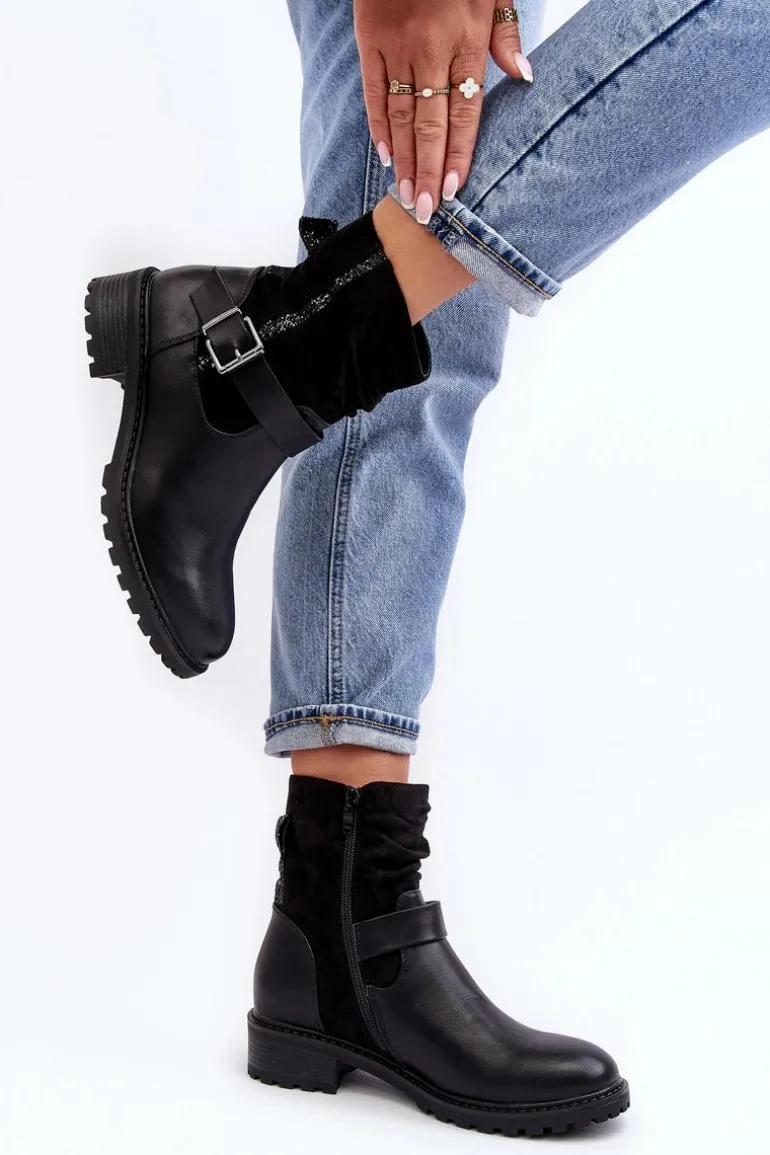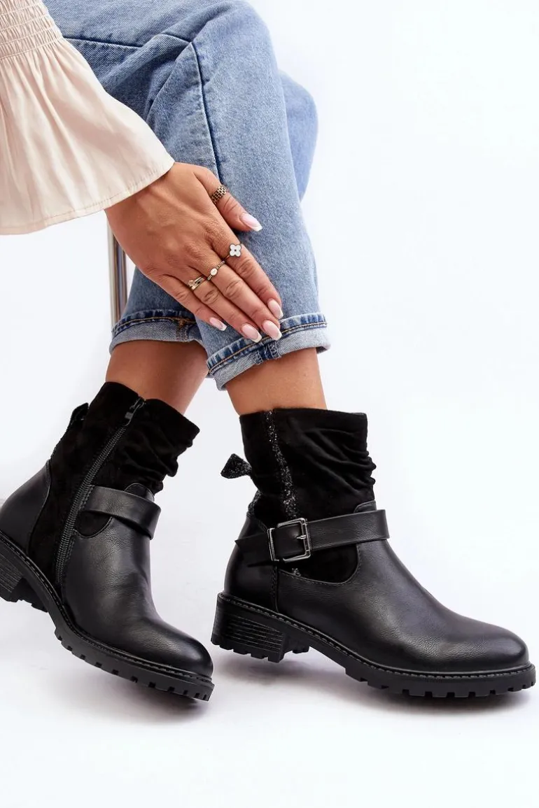 Botki damskie z marszczoną cholewką za kostkę. Wykonane z połączenia eko skóry i eko zamszu. Osadzone na płaskim, stabilnym obcasie. Noski zaokrąglone. Zapiętek usztywniony. Zapinane na suwak. Cholewka ozdobiona małymi cekinami oraz paskiem z klamrą. Ocieplone syntetycznym futerkiem w środku. Koniecznie powinnaś mieć ten model w swojej szafie! Przy wyborze rozmiaru prosimy sugerować się tabelą rozmiarów.