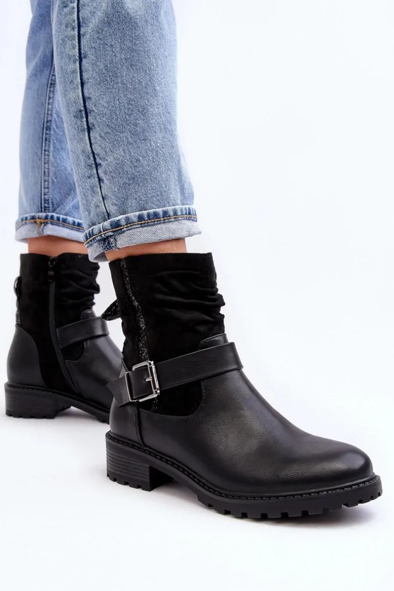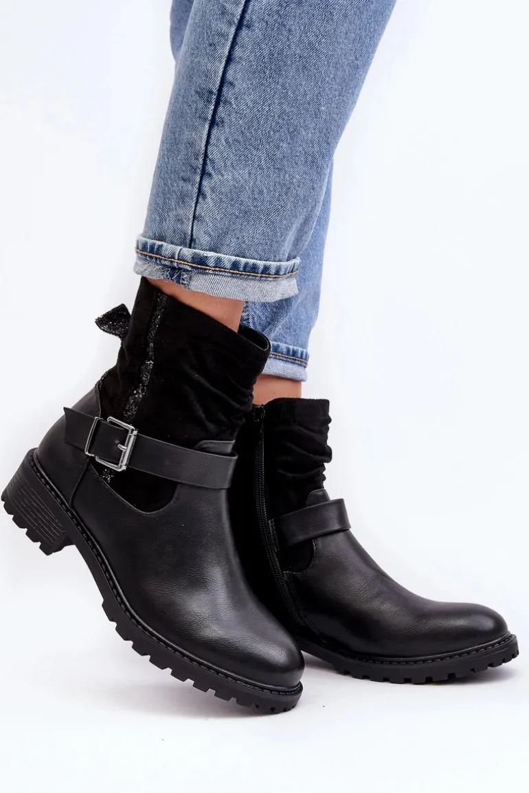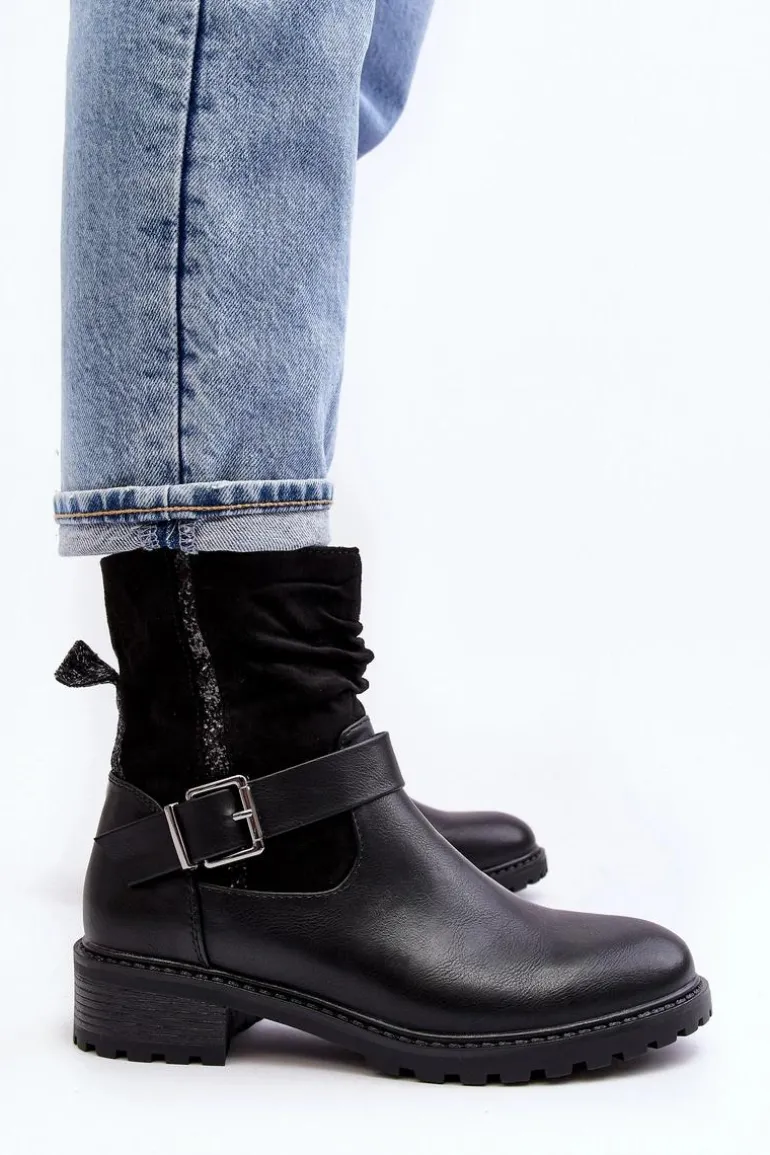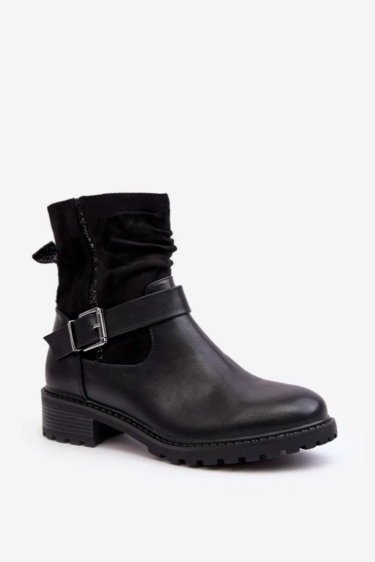 Botki damskie z marszczoną cholewką za kostkę. Wykonane z połączenia eko skóry i eko zamszu. Osadzone na płaskim, stabilnym obcasie. Noski zaokrąglone. Zapiętek usztywniony. Zapinane na suwak. Cholewka ozdobiona małymi cekinami oraz paskiem z klamrą. Ocieplone syntetycznym futerkiem w środku. Koniecznie powinnaś mieć ten model w swojej szafie! Przy wyborze rozmiaru prosimy sugerować się tabelą rozmiarów.