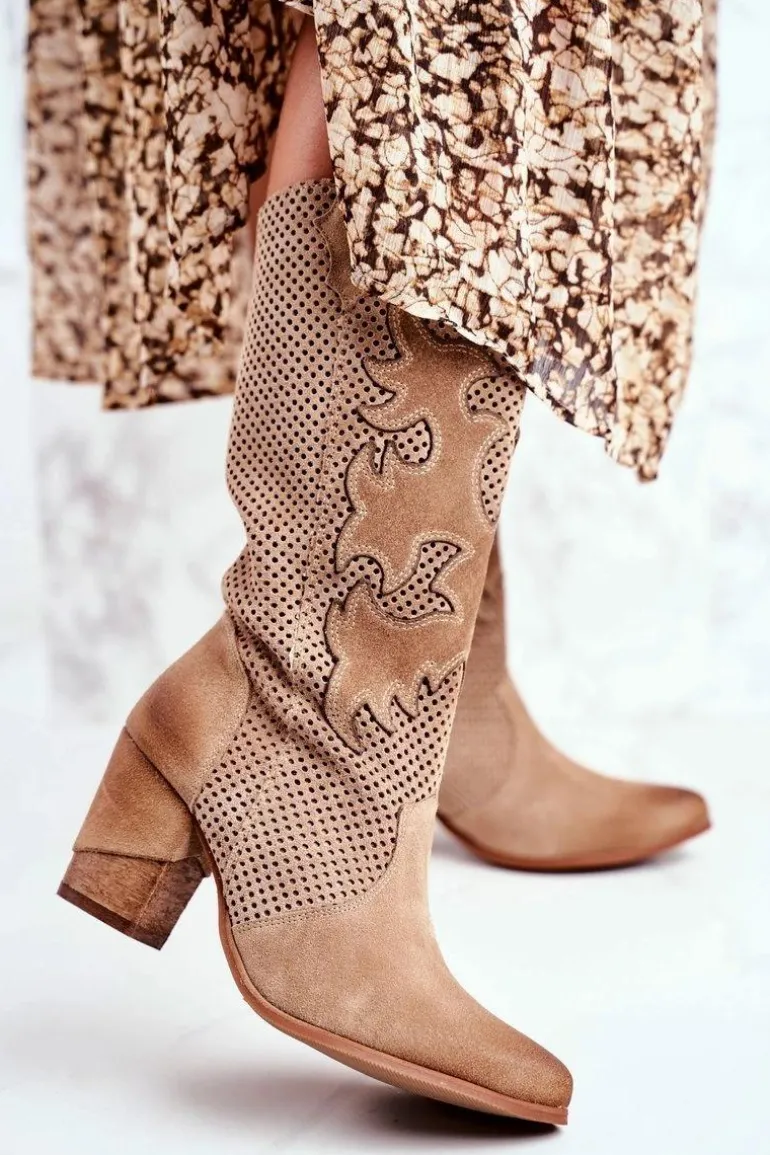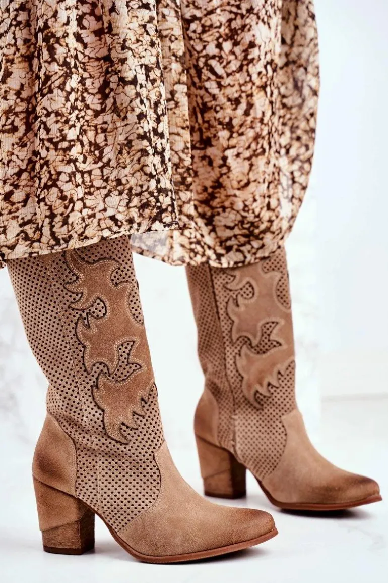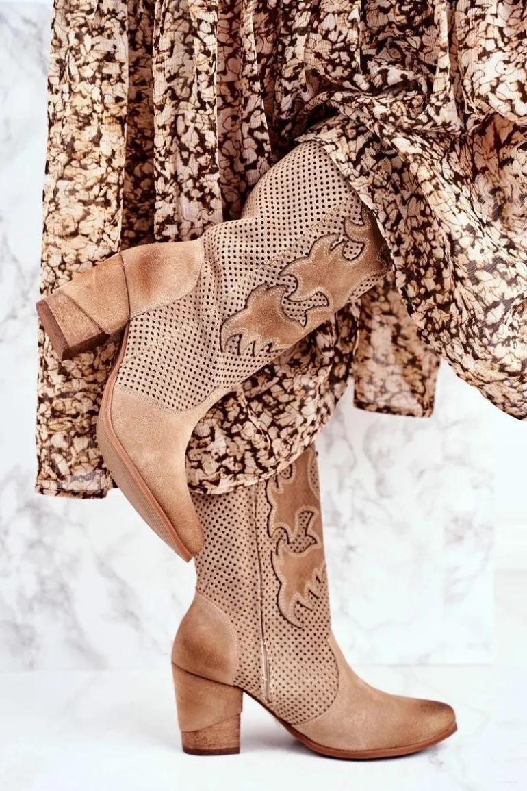 Damskie Botki Na Słupku Beżowe Skórzane Wysokie Rosemary