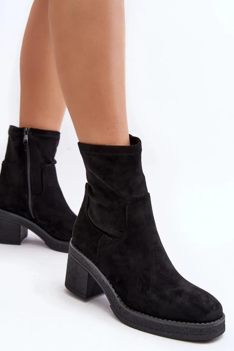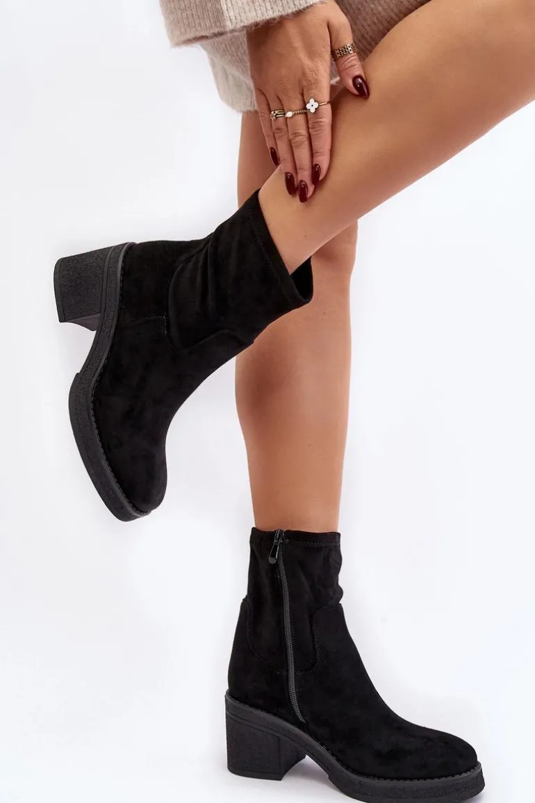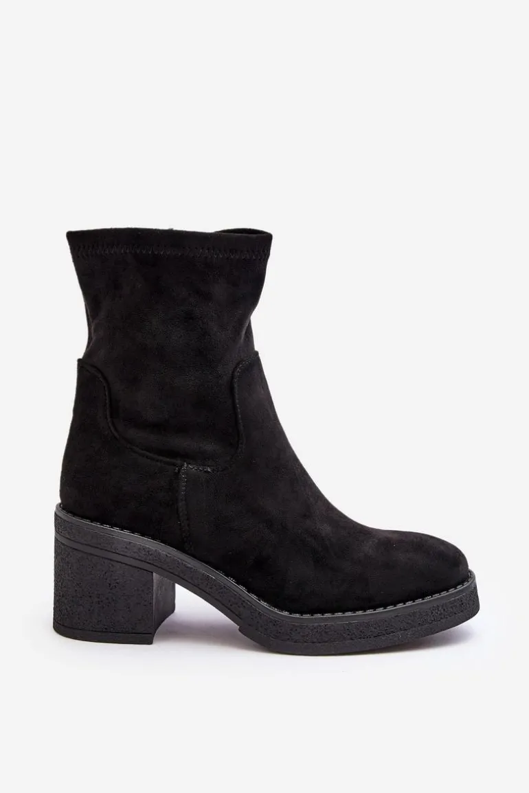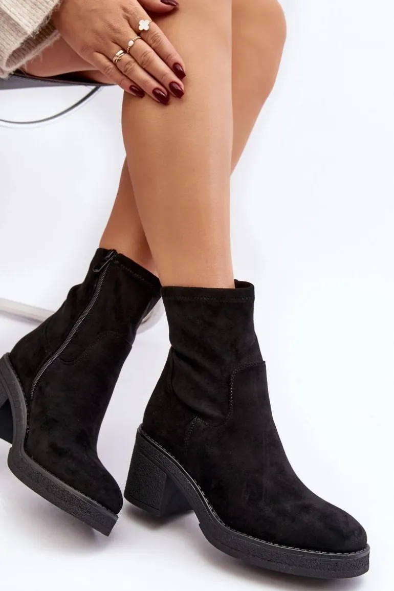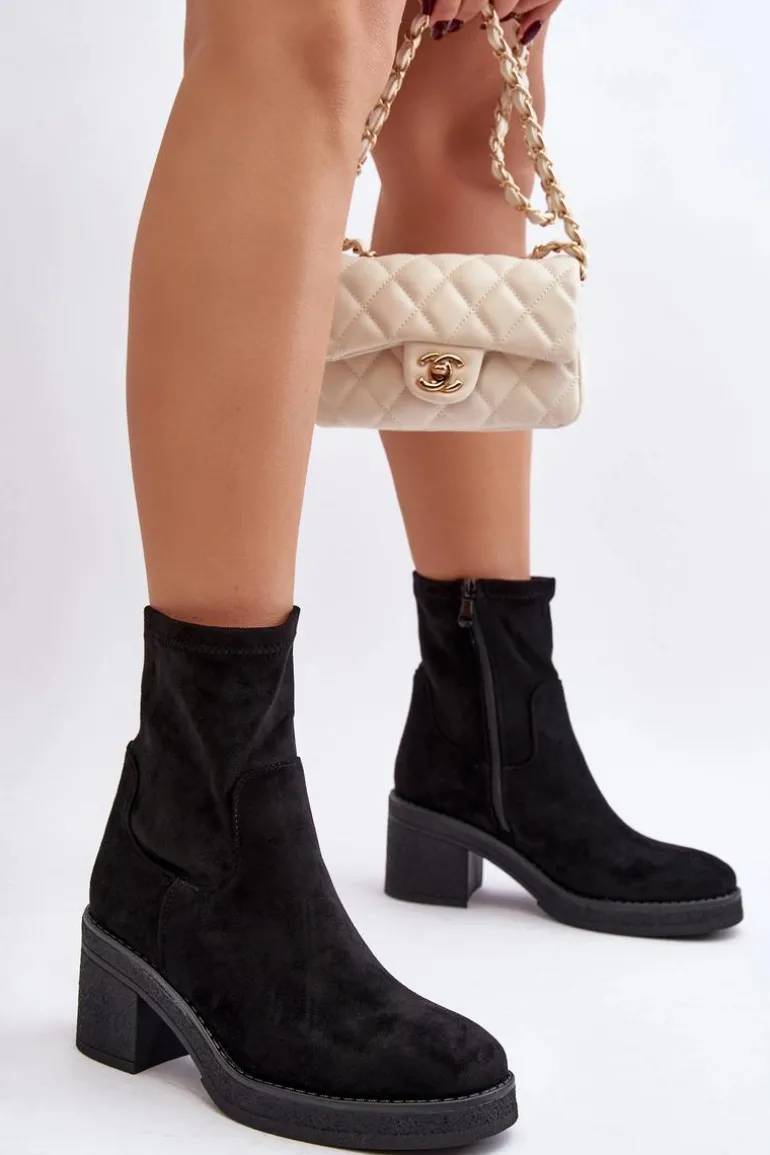 Klasyczne botki damskie, które dopasujesz do wielu jesienno-zimowych stylizacji! Wykonane z eko zamszu. Osadzone na obcasie w postaci słupka. Noski zaokrąglone. Środek częściowo ocieplony kocem obuwniczym. Koniecznie musisz je mieć! Przy wyborze rozmiaru prosimy sugerować się tabelą rozmiarów.