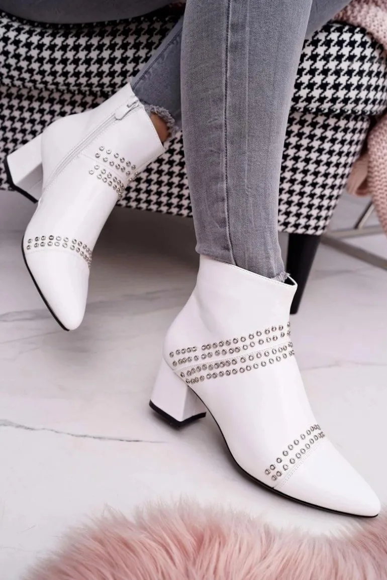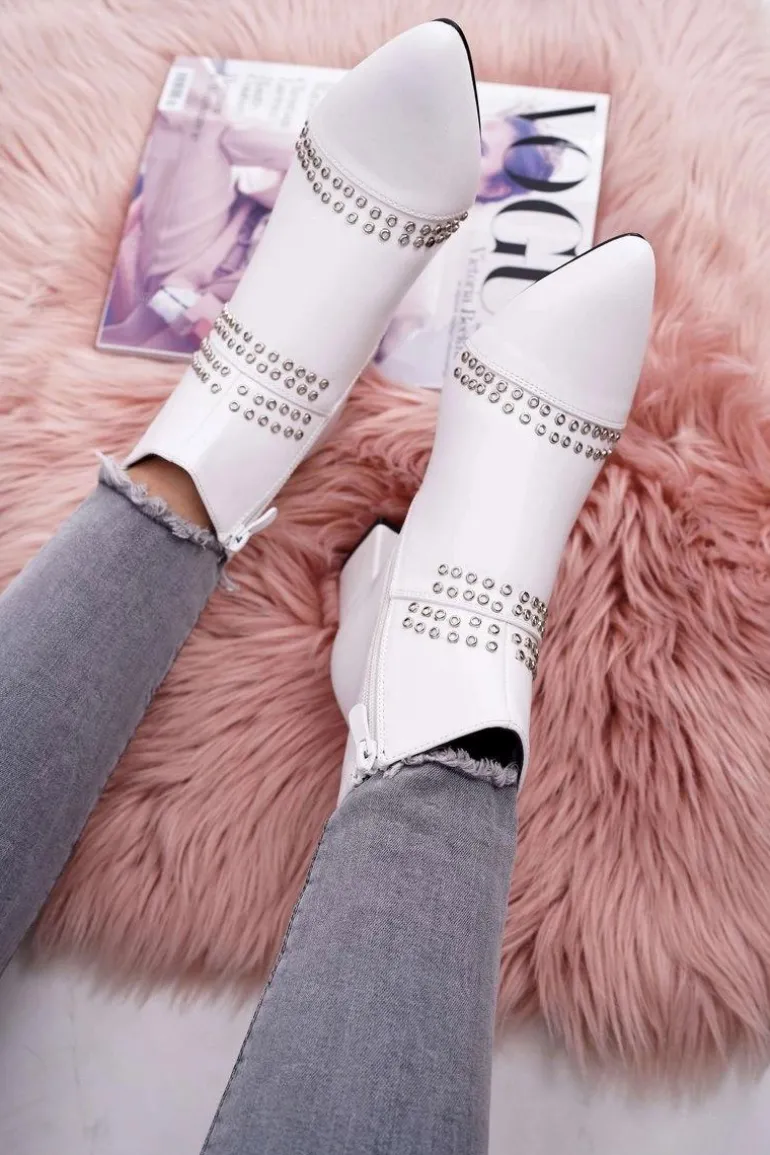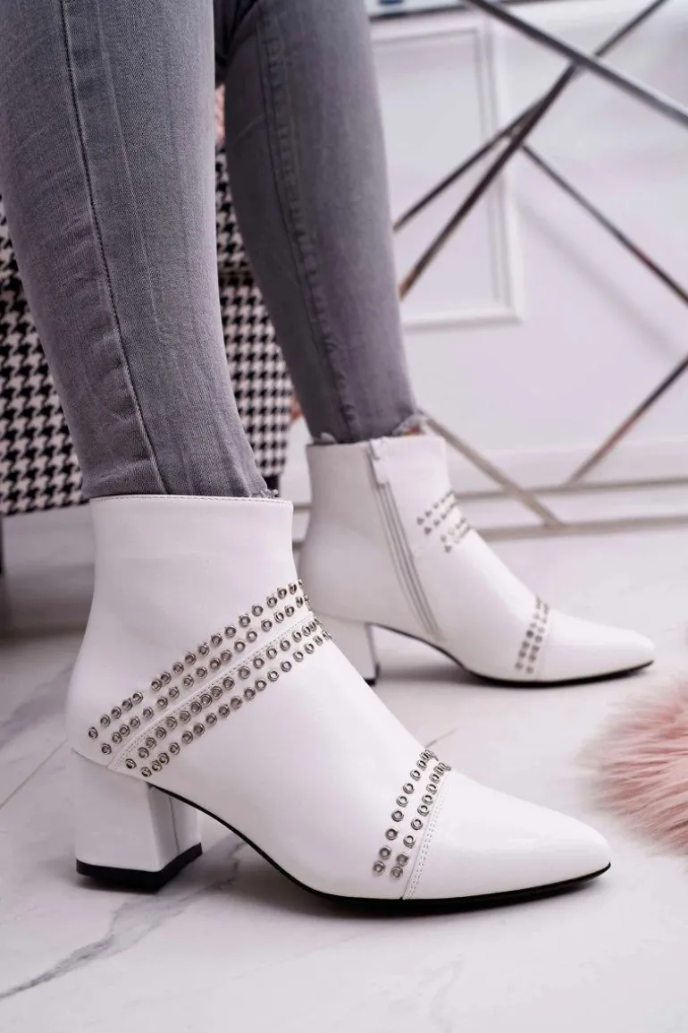 Damskie Botki Na Słupku W Szpic Z Nitami Białe Primma