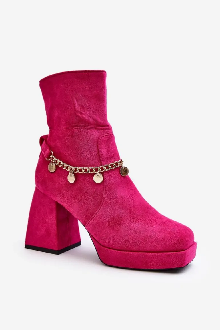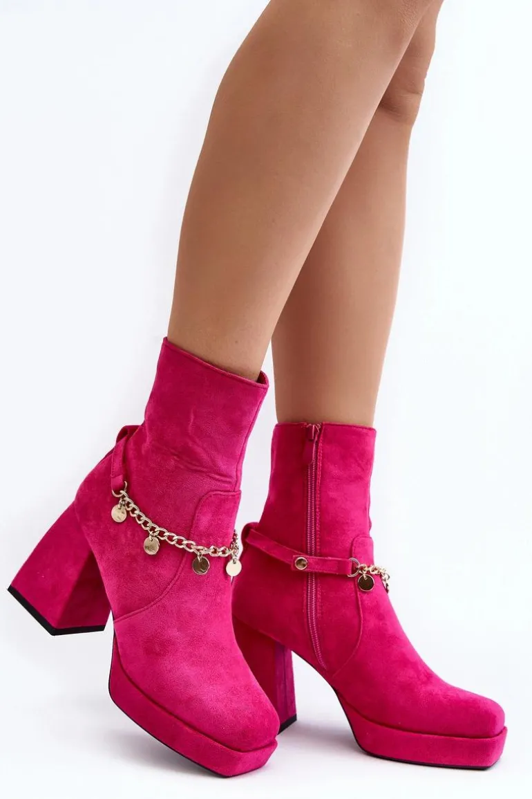 Botki damskie zostały wykonane z eko zamszu, co nadaje im eleganckiego wyglądu. Charakteryzują się solidnym obcasem typu klocek oraz noskami w kształcie kwadratu, dodającymi nutę nowoczesności. Usztywniony zapiętek zapewnia stabilność i wygodę podczas użytkowania. Cholewka ozdobiona łańcuszkiem. Botki te będą idealnym dodatkiem do jesiennych stylizacji! Przy wyborze rozmiaru prosimy sugerować się tabelą rozmiarów.